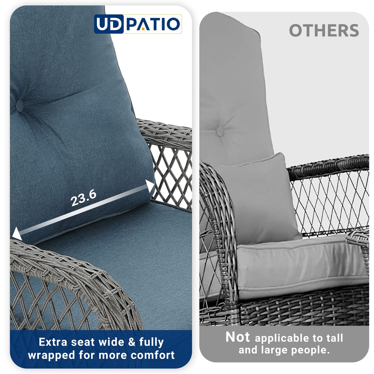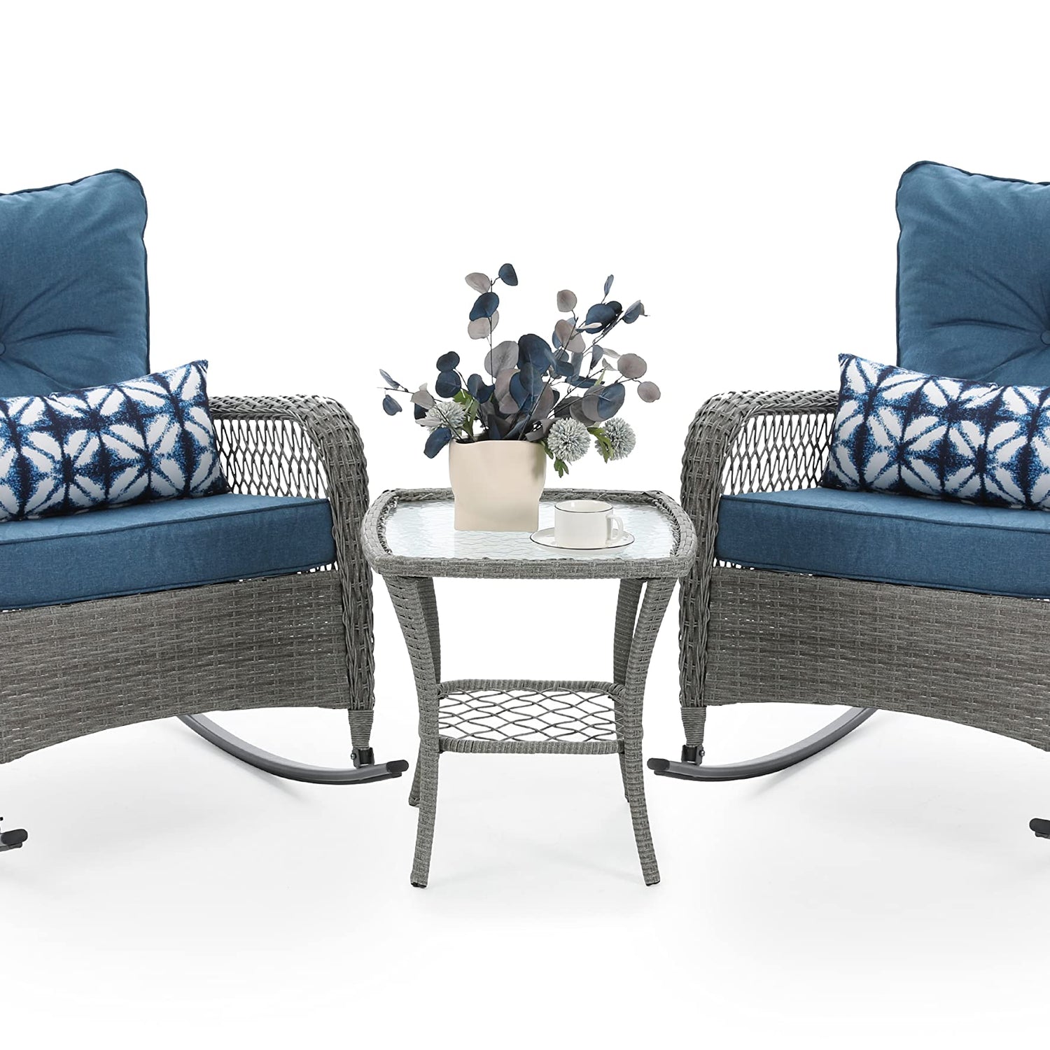 UDPATIO 3 Piece Patio Set Rocking, Rattan Outdoor Rocking Patio Bistro Set with 2 Rockers and 1 Side Table with 4‘’ Thick Cushions for Backyard, Porch, Balcony, Poolside(Blue)