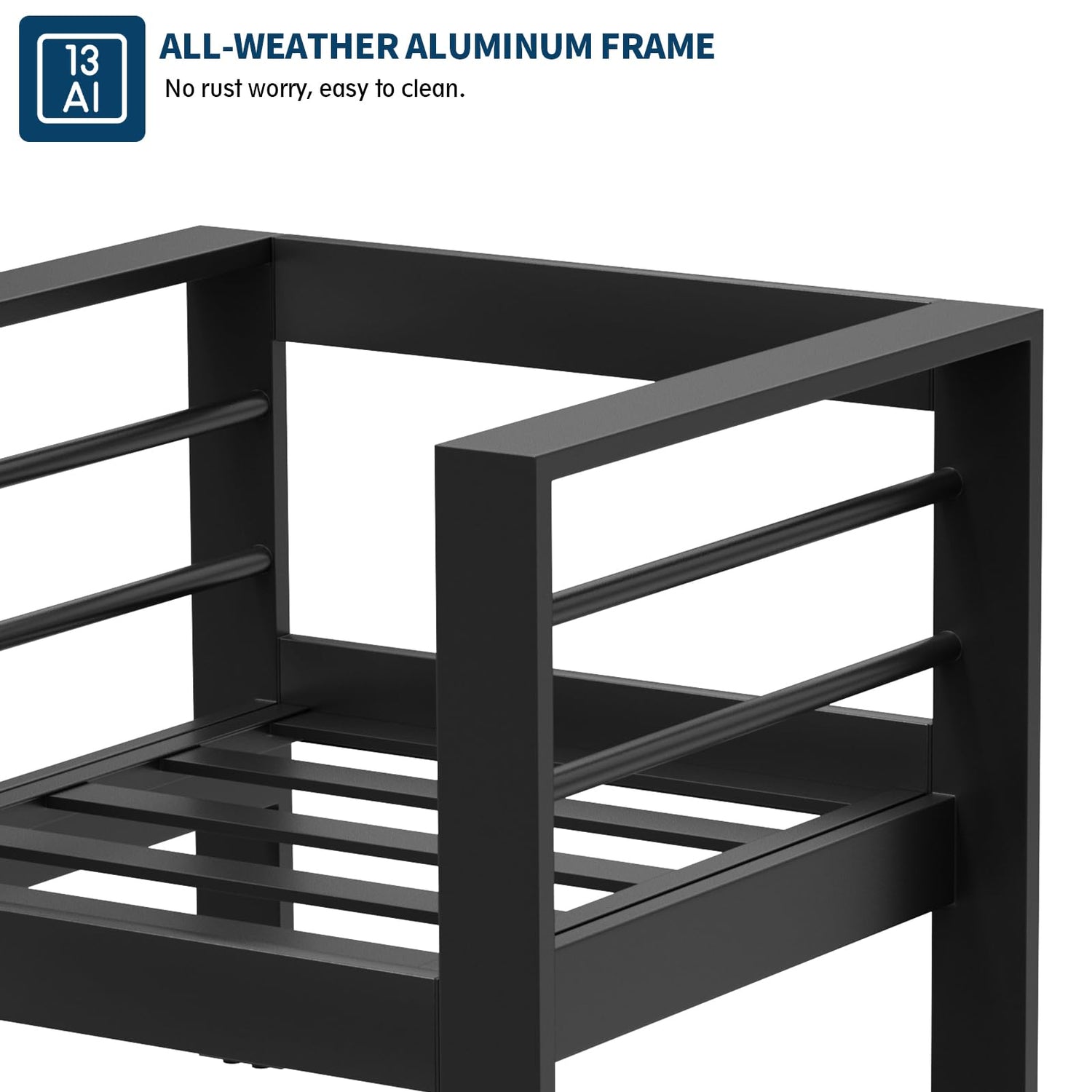 - 5" Thick Sofa Cushion, Comfort: The aluminum outdoor furniture is equipped with 5 inch thick cushion, The interior is filled with high-quality resilience and high density sponge, providing you with excellent sitting.