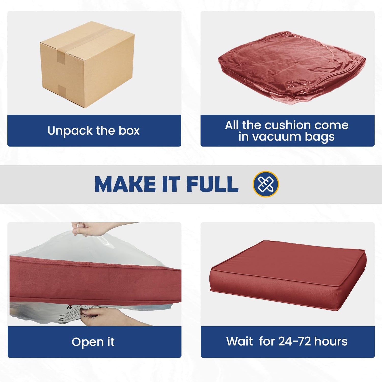 - 【TIPS】: Patio furniture cushions usually fully rebound in about 24 hours, the cotton in the cushion may be uneven due to transportation, you can open the zipper to organize the cotton,make it more fluffy.