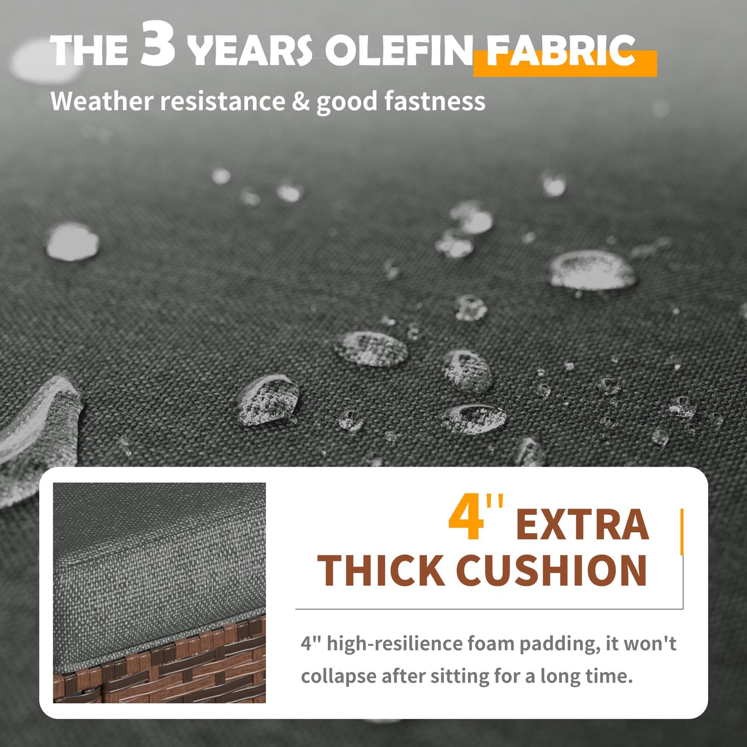 - EXTRA COMFORT OLEFIN CUSHION:Cushions are upholstered in top-of-the-line Olefin fabric, offering ultimate comfort, easy cleanability, and stain resistance. The 4-inch thick cushion is filled with a thickened high-resilience sponge to stay fluffy non-deformation and give your body plenty of support