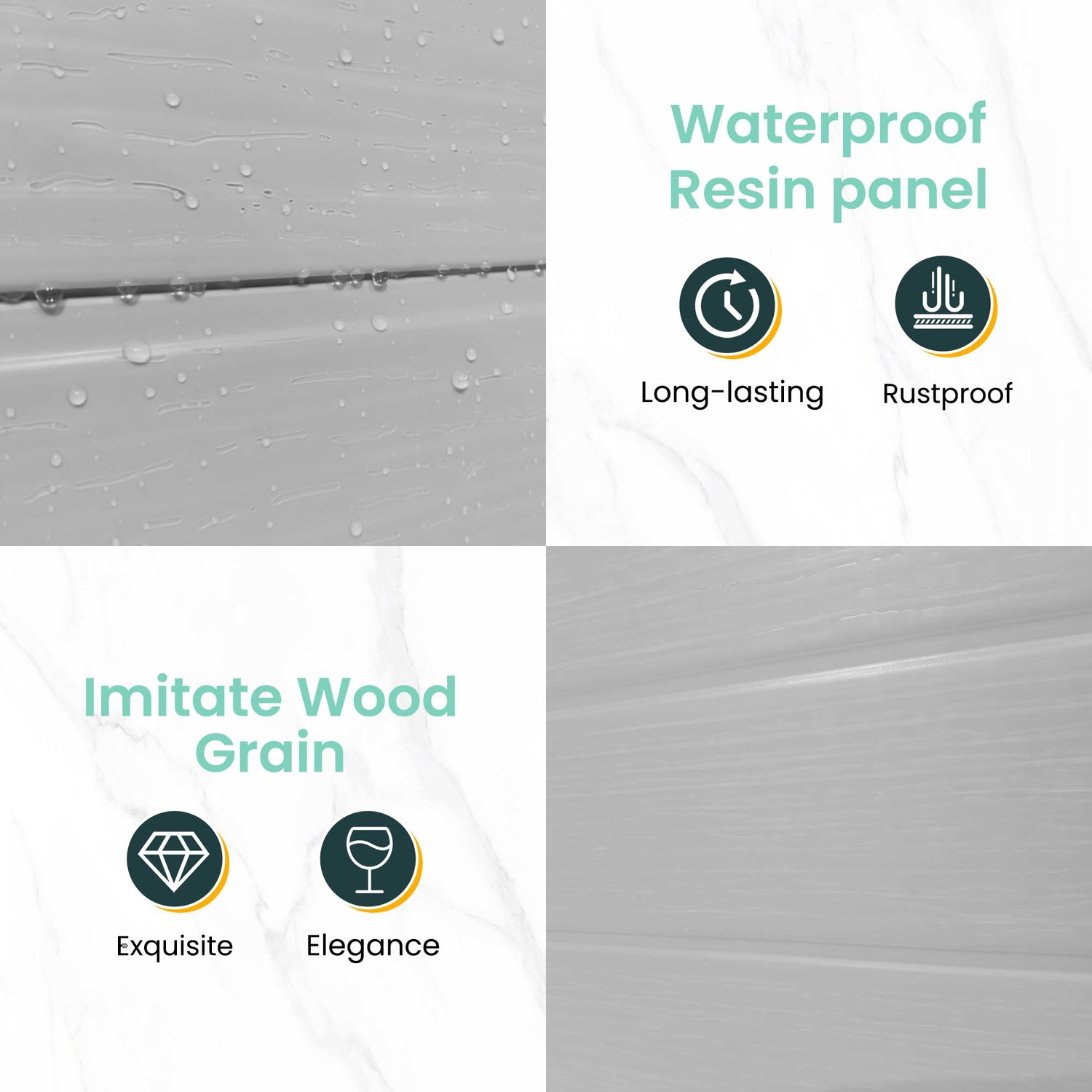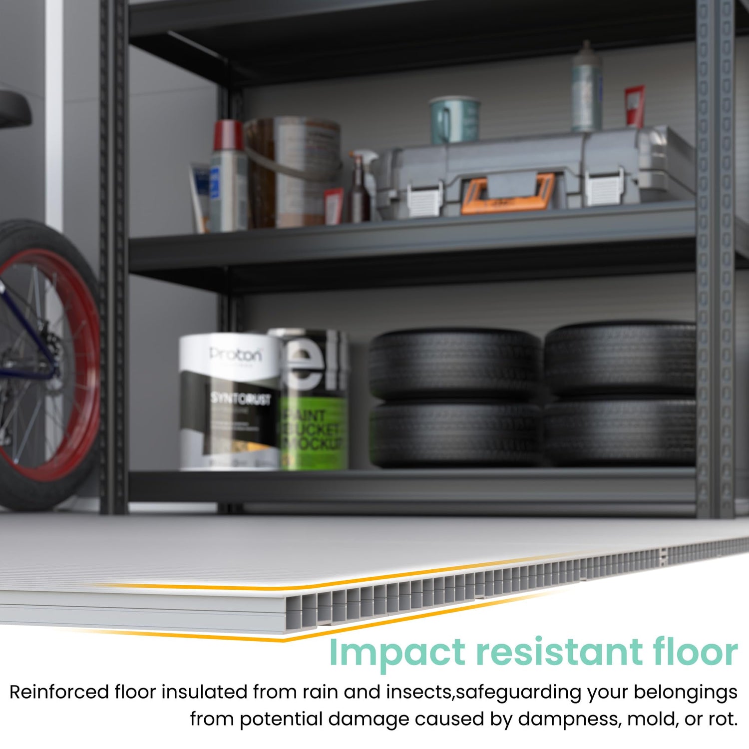 - RESIN MATERIAL: Our storage shed is crafted with 12MM premium polypropylene resin plastic, which is recyclable and eco-friendly. Resin shed is corrosion-resistant, waterproof, rustproof and with UV protection for more than 8000 hours, less bending and puncturing, worry-free for use in all weather conditions. It can be used daily for five years without fading