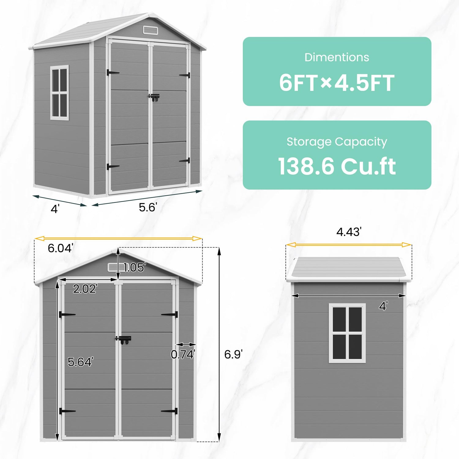 - SPACIOUS 6'x4.5' STORAGE SHED: Roof: 71.65"(L)x53.35"(W); Base: 67.13"(L)x 4843"(W); Hight 82.28"(H). UDPATIO resin shed offers a generous amount of storage room for various items such as gardening tools, outdoor sports gear, and seasonal items. It serves as a valuable extension to your yard, whether storing tools or providing a cozy home for your pet, or use as a bin storage room, it can satisfy your various requirements