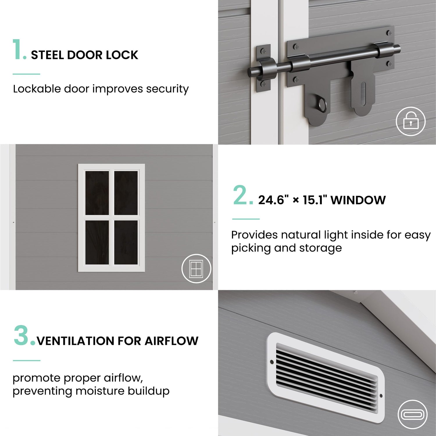 - STURDY FLOOR & 24.6"X15.1" WINDOW: Equipped with a sturdy floor, our outdoor storage cabinet effectively prevents moisture from seeping into the structure, safeguarding your belongings from potential damage caused by dampness, mold, or rot. The window design facilitates ventilation and natural light. It allows the visibility of tools from the outside and enhances the aesthetics of the shed