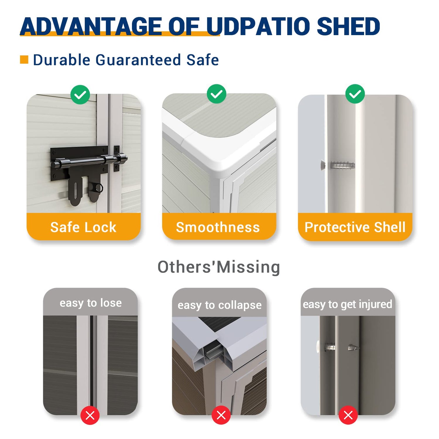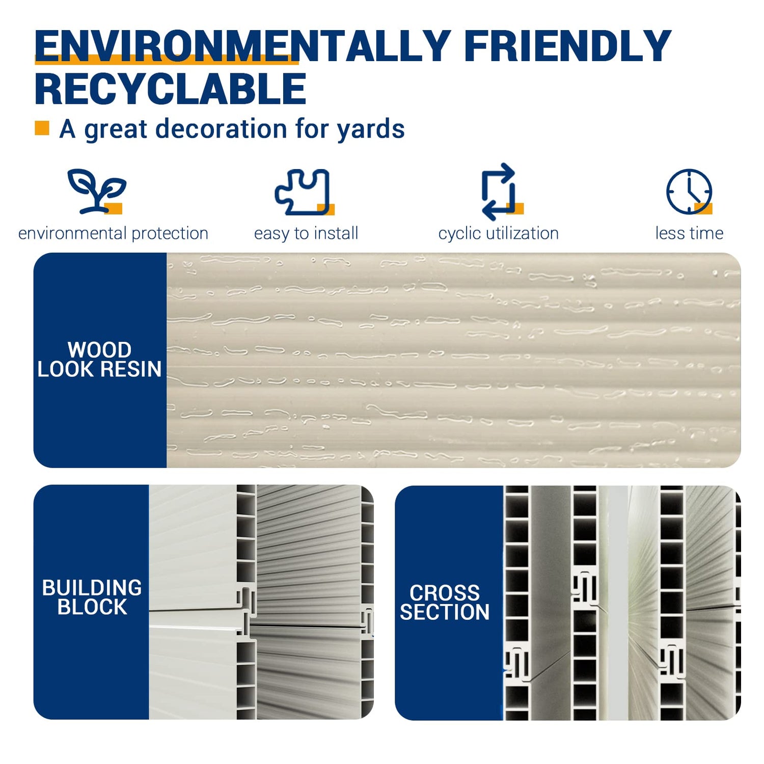 - 🏡【ECO-FRIENDLY RESIN MATERIAL】Our storage shed is crafted with 12MM premium polypropylene resin plastic, which is recyclable and eco-friendly. Resin shed is corrosion-resistant, waterproof, rustproof and with UV protection for more than 8000 hours, less bending and puncturing, worry-free for use in all weather conditions. It can be used daily for five years without fading.