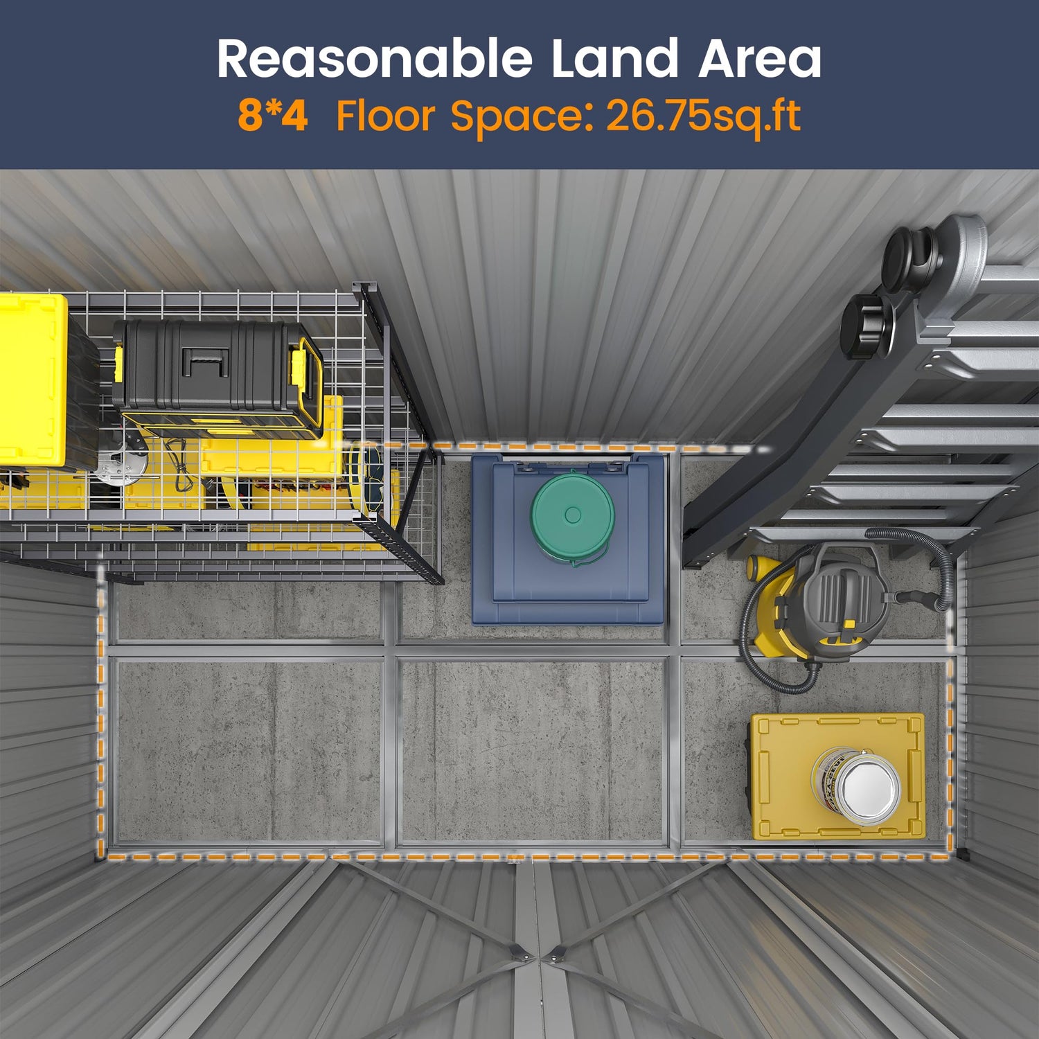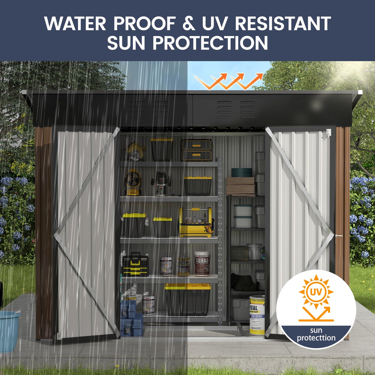 - Sturdy Storage Shed Thicker galvanized steel construction and fewer accessories makes this shed rustproof and UV-resistant. Overlapped wall panels features with waterproof and moister-resistant, worry-free for all weather condition use