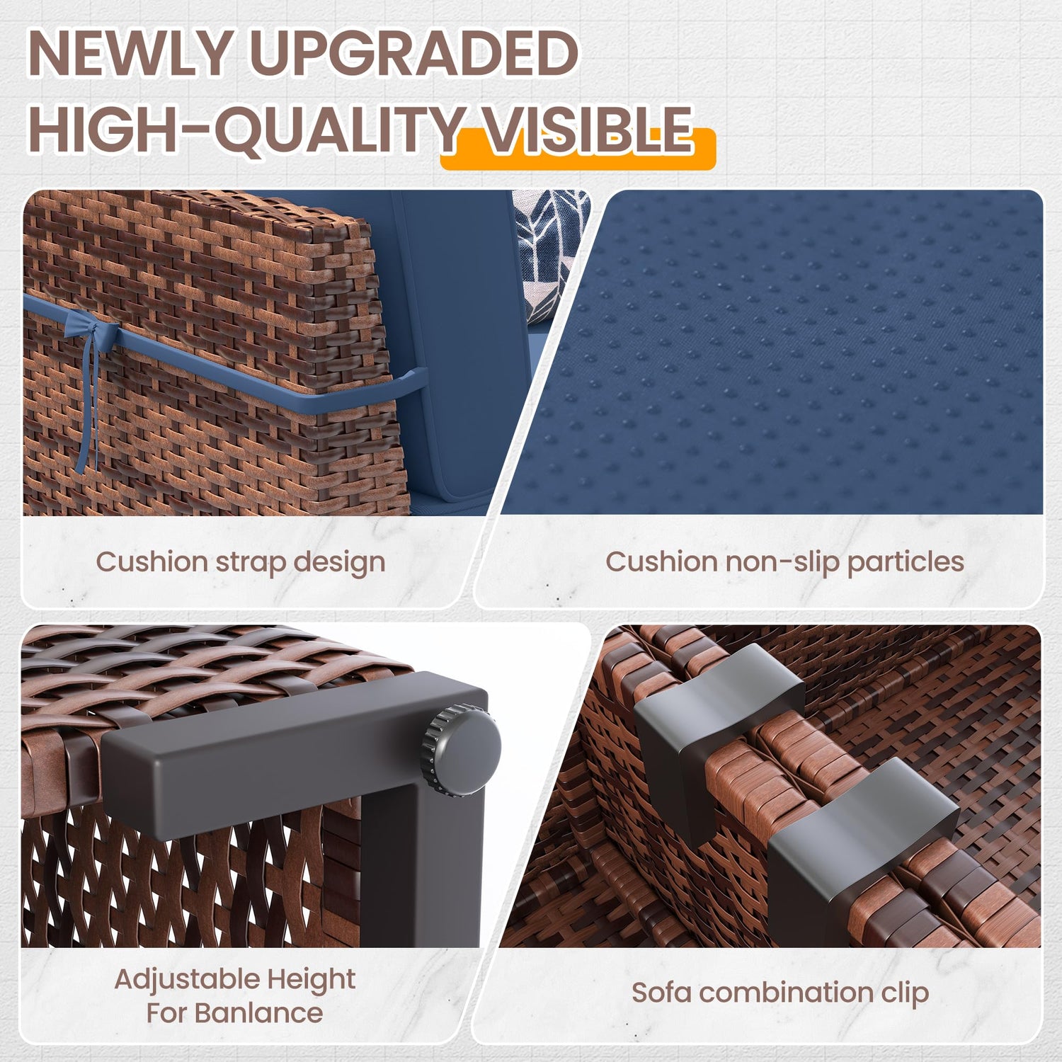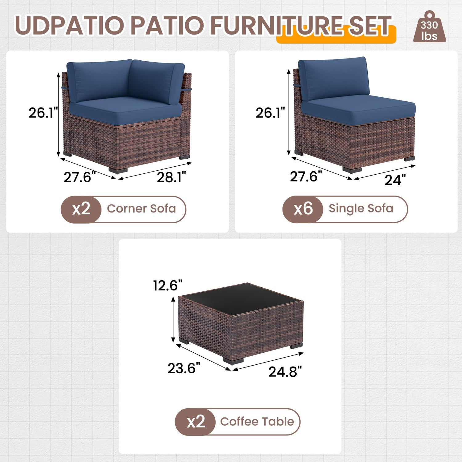 UDPATIO Patio Furniture Set, Modular Outdoor Sectional with 105°Slanted Back, 10 Pieces Rattan Conversation Set for Poolside, Backyard, Deck, with Coffee Table, Waterproof Cover, Blue