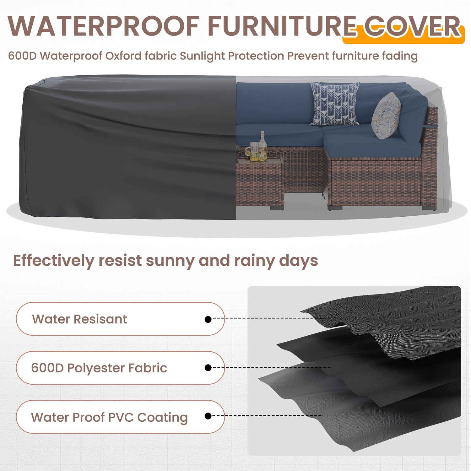 - Includes Waterproof Cover:Our wicker patio furniture has a 100% waterproof sofa cover. The outer layer is treated with a waterproof and water repellent coating, with a 500D Oxford cloth design in the middle and a PU coating added to the back. There is an adjustable drawstring design below. Provide protection for the sofa in heavy rain and prevent accelerated aging caused by strong summer sunlight.