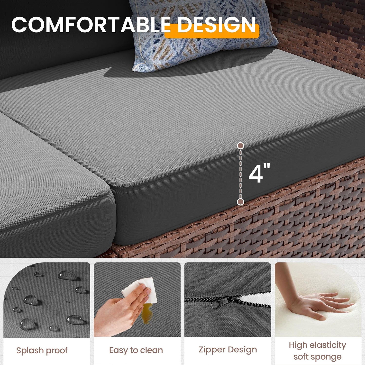 - Ergonomic Slanted Bcskest:UDPATIO outdoor sectional adopts ergonomic design, with a 105 ° backrest design,and the unique leaning matches the natural curves of the human body when sitting. The 4-inch thick cushions of patio set provide enhanced softness and support. The mat is splash proof ,The silicone dotsand fixing straps on the cushion can stay away from the inconvenience of sliding,the zipper design is easy to clean and replace.