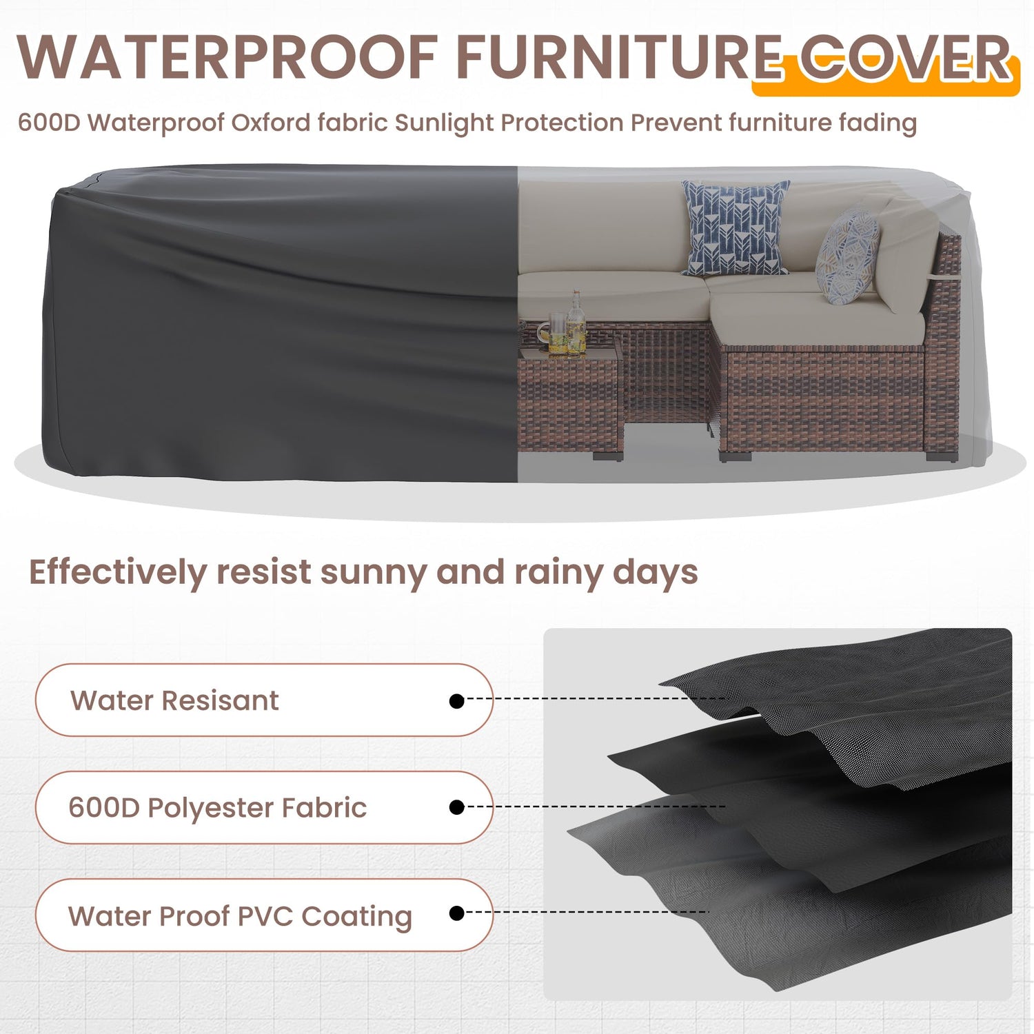 - Includes Waterproof Cover:Our wicker patio furniture has a 100% waterproof sofa cover. The outer layer is treated with a waterproof and water repellent coating, with a 500D Oxford cloth design in the middle and a PU coating added to the back. There is an adjustable drawstring design below. Provide protection for the sofa in heavy rain and prevent accelerated aging caused by strong summer sunlight.