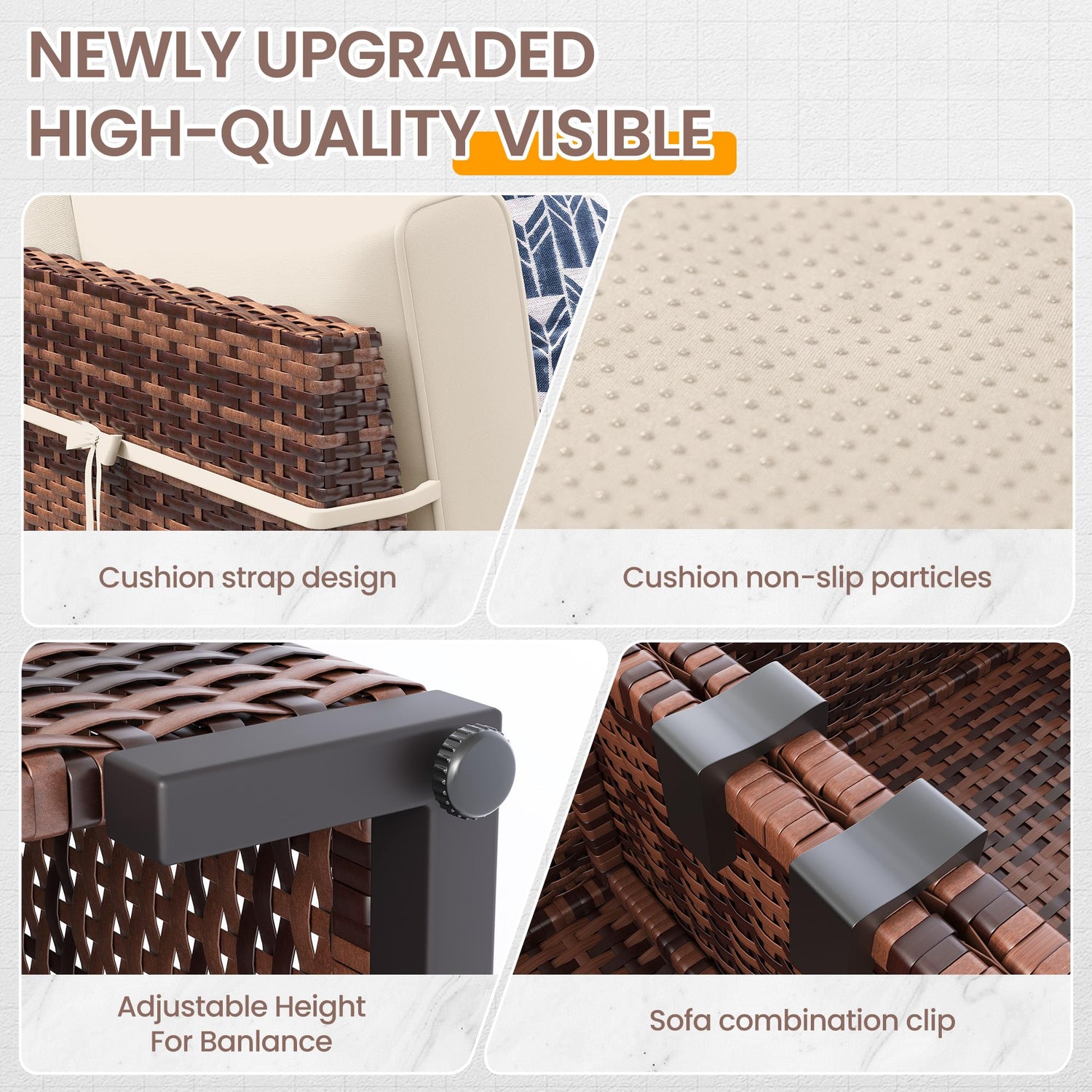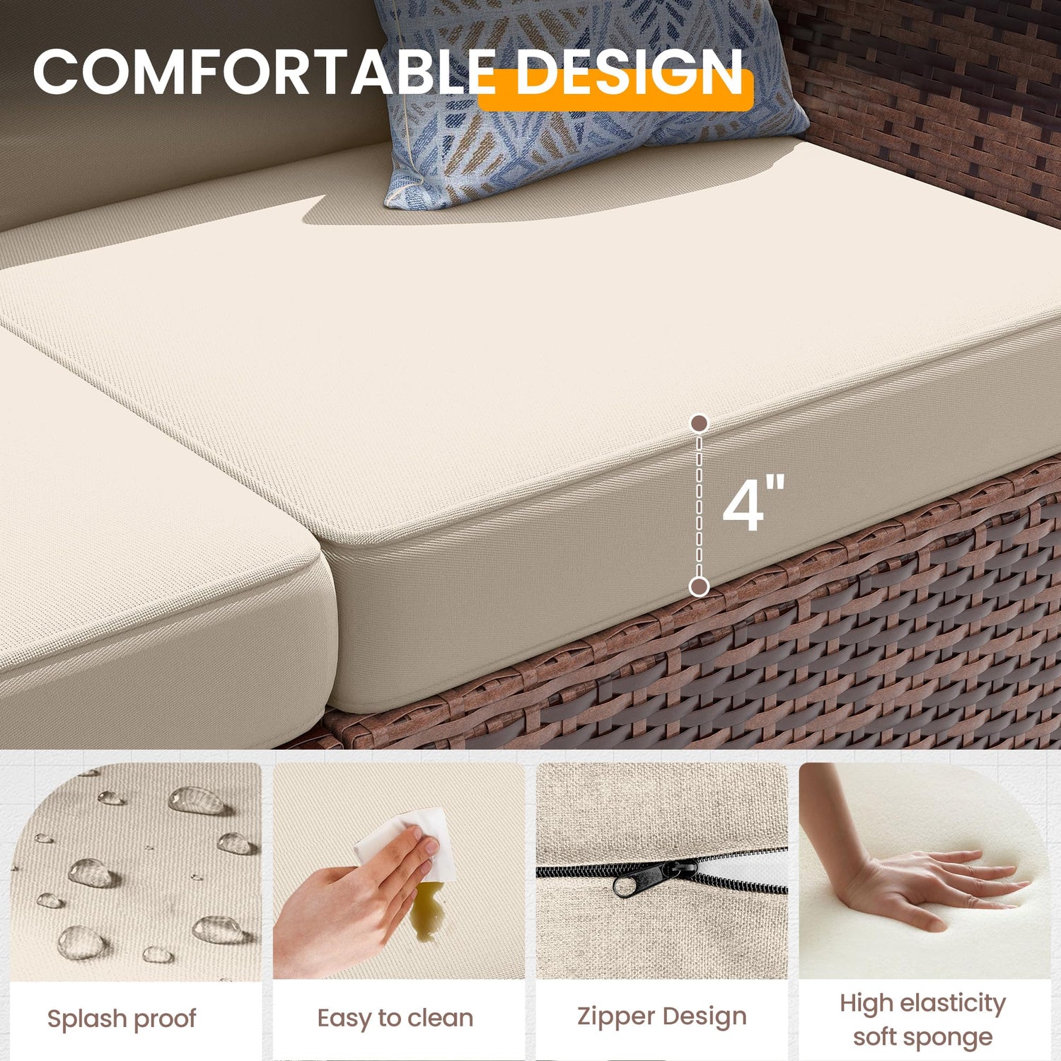- Ergonomic Slanted Bcskest:UDPATIO outdoor sectional adopts ergonomic design, with a 105 ° backrest design,and the unique leaning matches the natural curves of the human body when sitting. The 4-inch thick cushions of patio set provide enhanced softness and support. The mat is splash proof ,The silicone dotsand fixing straps on the cushion can stay away from the inconvenience of sliding,the zipper design is easy to clean and replace.