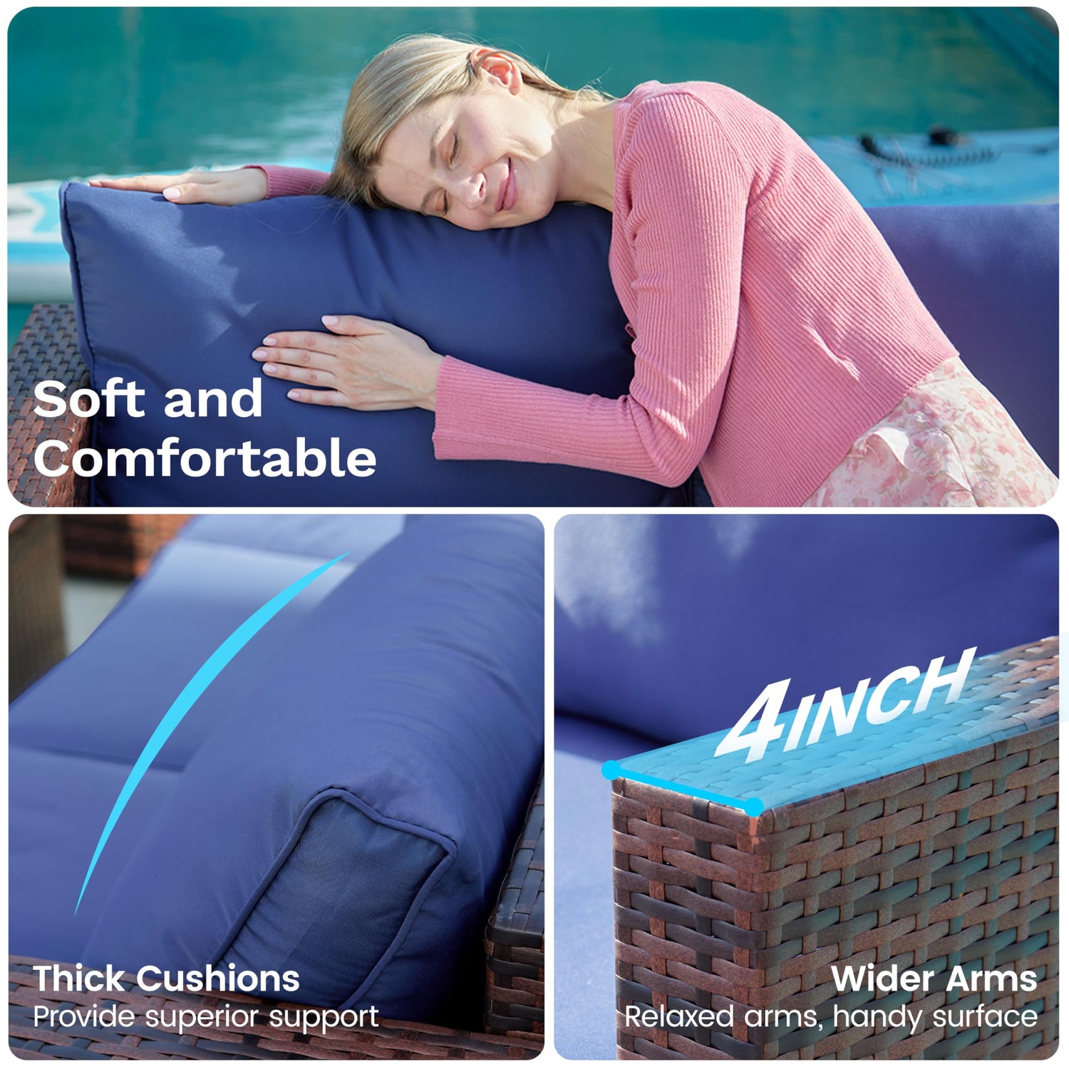 - Upgrade Comfort for Relaxation: Experience cloud-like comfort with outdoor sectional furniture set, featuring 4 inch thick seat cushions and super-thickened back cushions that conform to your body's curves. The seat cushion's underside features non-slip silicone points, a key solution to the common issue of outdoor sofa cushions sliding. Removable, washable cushion covers make maintenance easy and keep your outdoor furniture sets looking great.