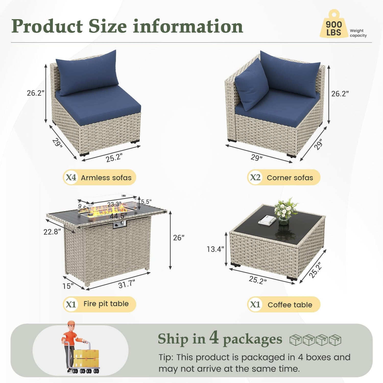 - Outdoor Sectional Furniture: 8 pieces rattan outdoor furniture set includes 2 corner sofas, 4 armless sofas,1 fire pit table and 1 coffee table. Free to combine and match, perfect for poolside, patio, backyard, or lawn