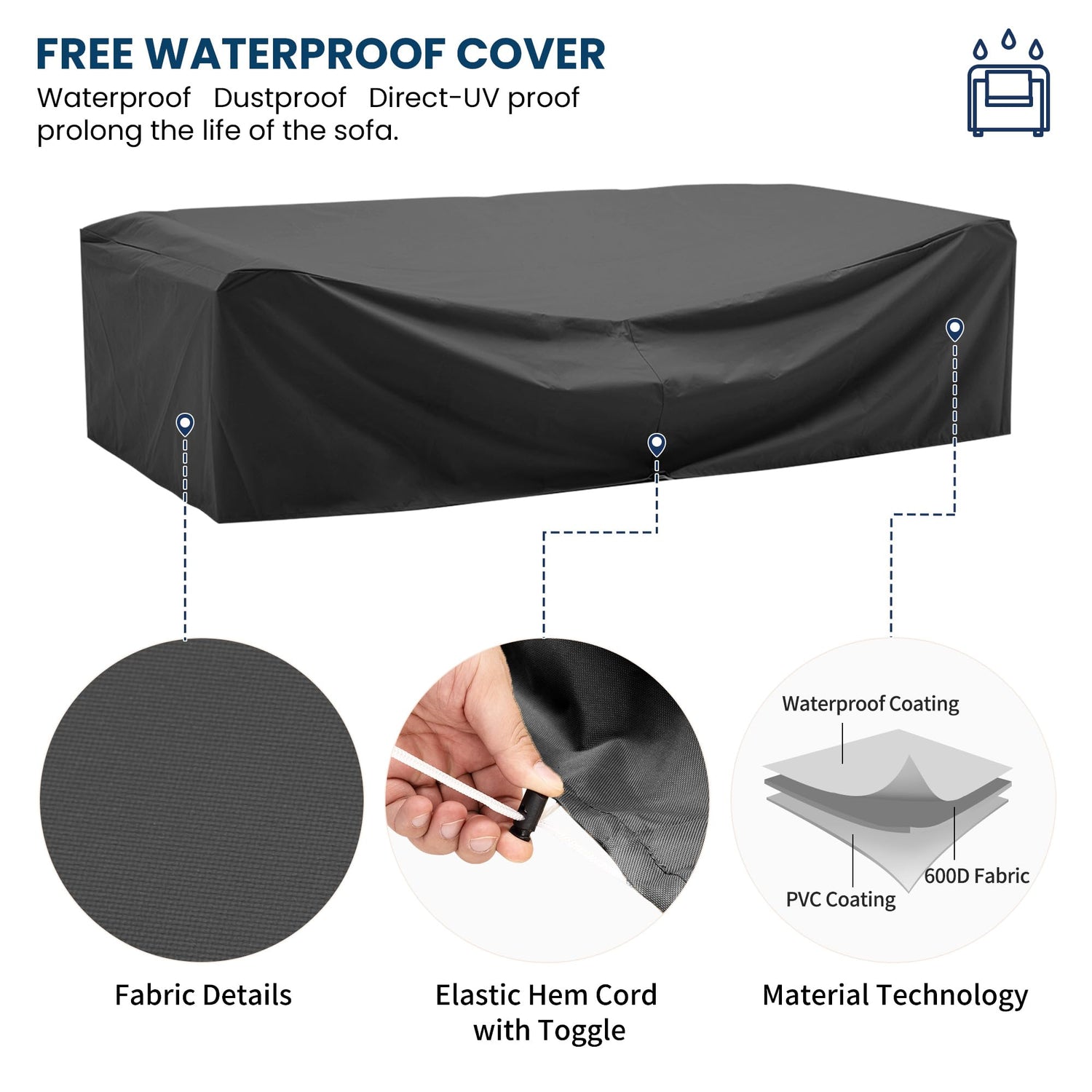- Includes Waterproof Cover: Our offering features 100% waterproof sofa cover. The outer layer is treated with a waterproof and water-repellent coating, the middle layer employs 600-density fabric, and the inner layer is coated with waterproof PVC. The cover, equipped with adjustable hem cords, undergoes a triple craftsmanship process, ensuring resilience against stains and harsh weather. This design promotes durability, keeping your sectional looking new for an extended period.