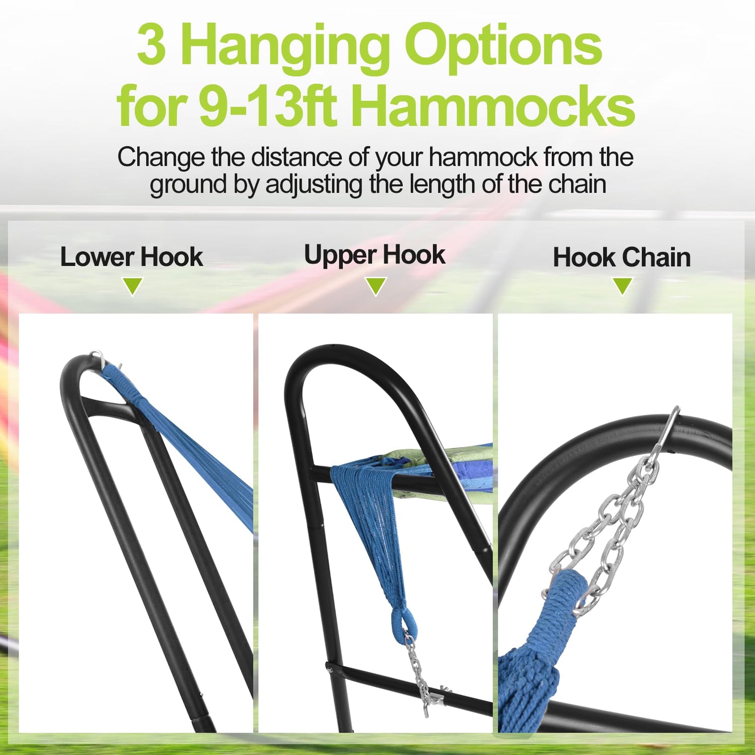- UNIVERSAL HAMMOCK STAND : Accommodate hammocks up to 9-13 ft long. The stand can support many types of hammocks with chains and S-hooks. And it is easy adjustable to any desired length. It can be used inside as a bed or outside on the patio, porch, deck, or backyard