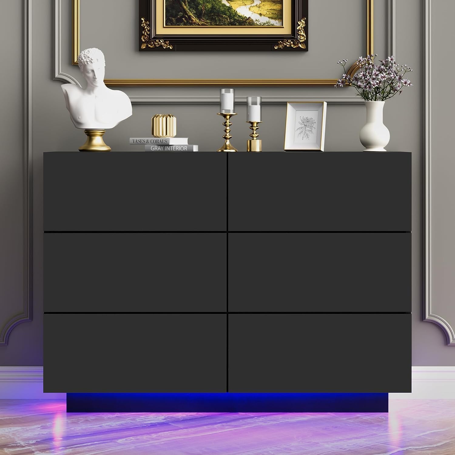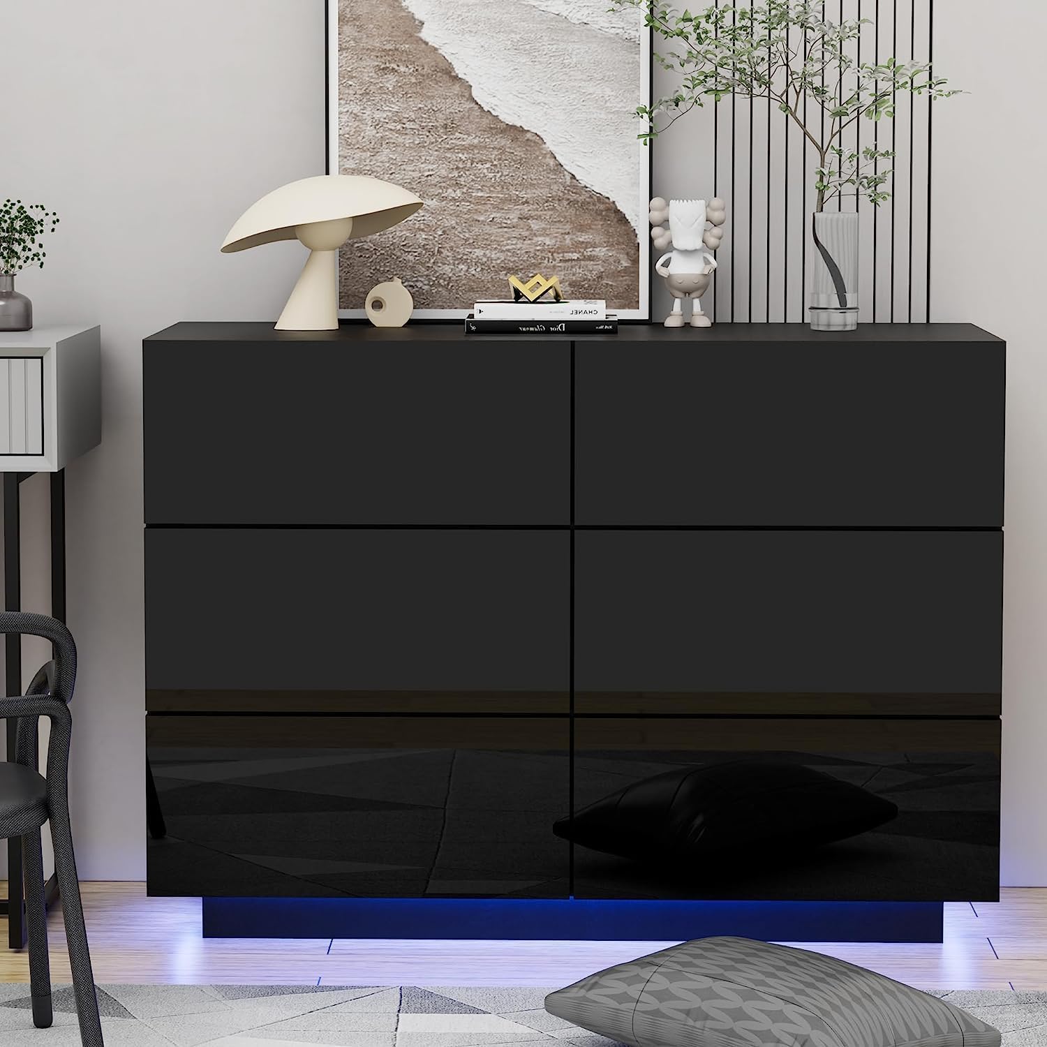 UEV LED 6 Drawer Dresser,White Dresser for Bedroom with Light,Chest of Drawers with High Glossy finsh for Bedroom,Living Room,Entryway(Black)