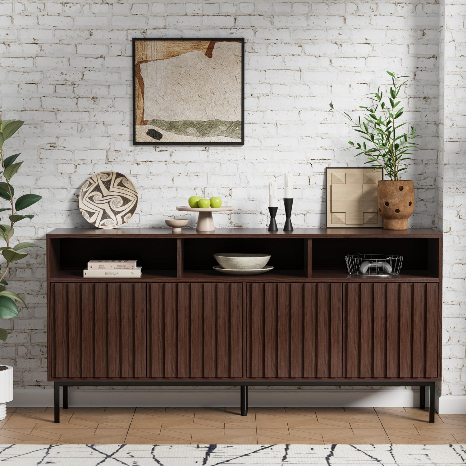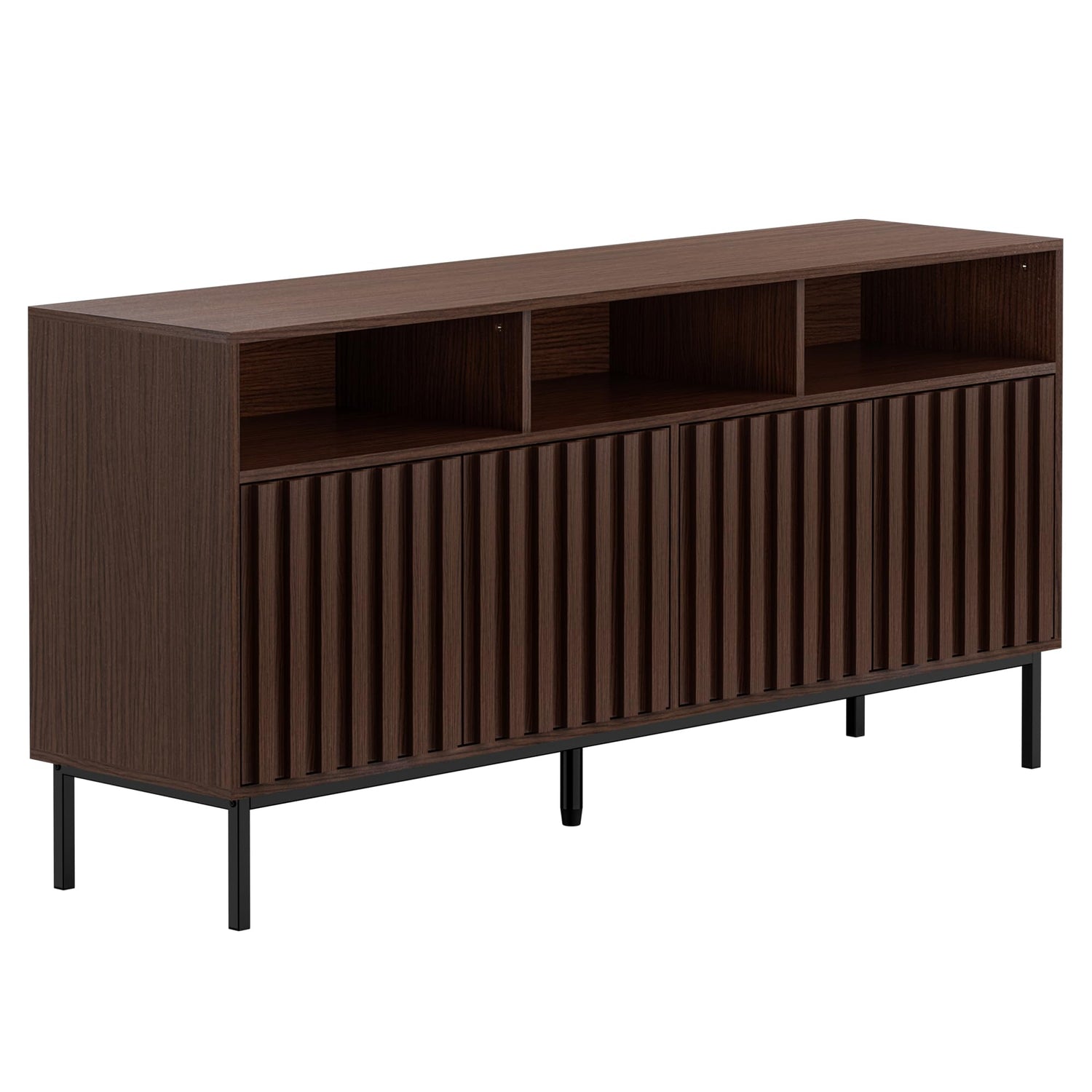 UEV Mid Century Modern Sideboard Buffet Cabinet with Storage, 61.4'' Fluted Sideboard Cabinet,Wood Buffet Cabinet with Metal Legs,Accent Credenza Storage Cabinet with 4 Doors and Spacious Top(Walnut)
