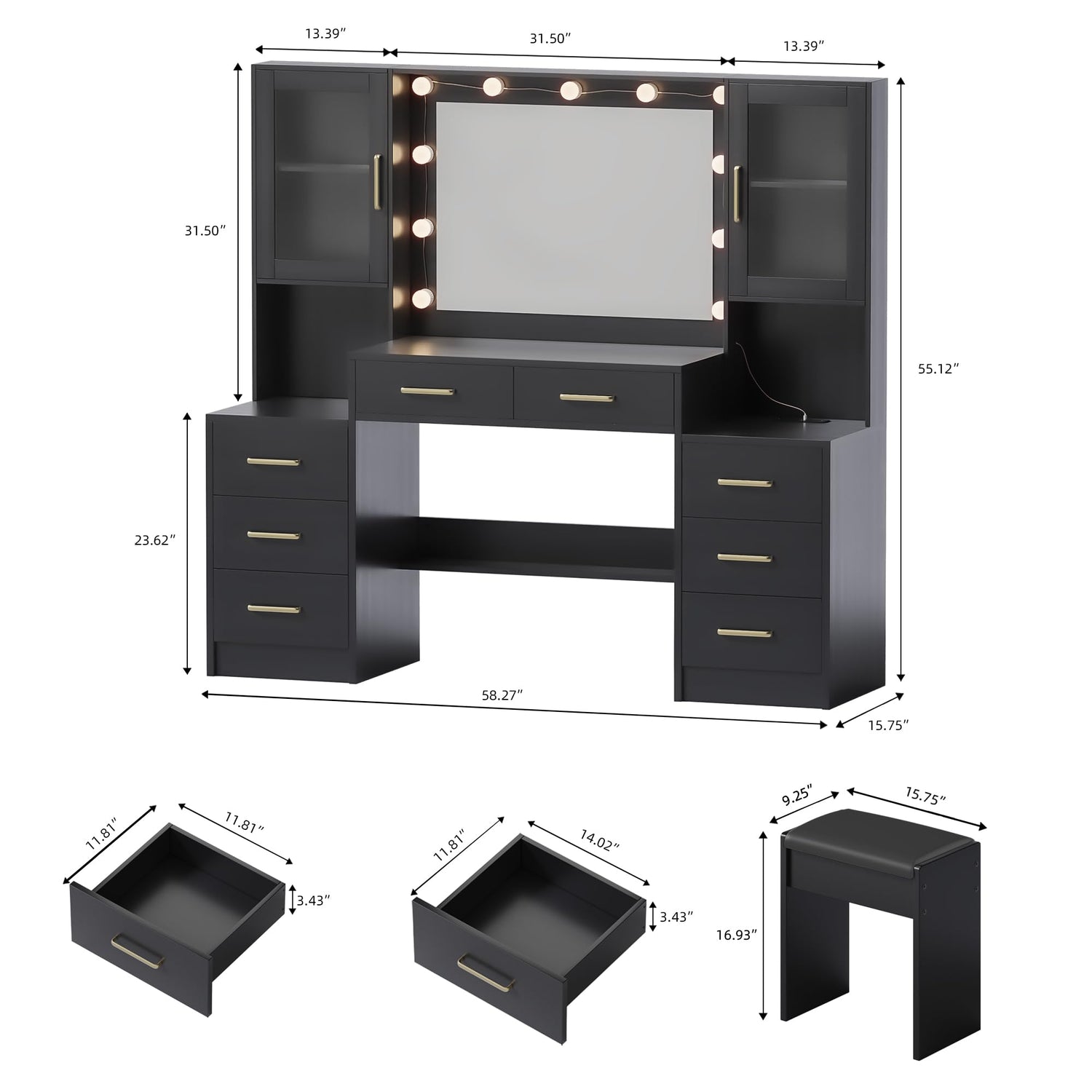 UGTOO Makeup Vanity Desk with Mirror and Lights, 58.3" Makeup Vanity with Lights & Charging Station, Dressing Table Vanity Set White Vanity Table with Cushioned Stool, 8 Drawers & 2 Cabinets Black