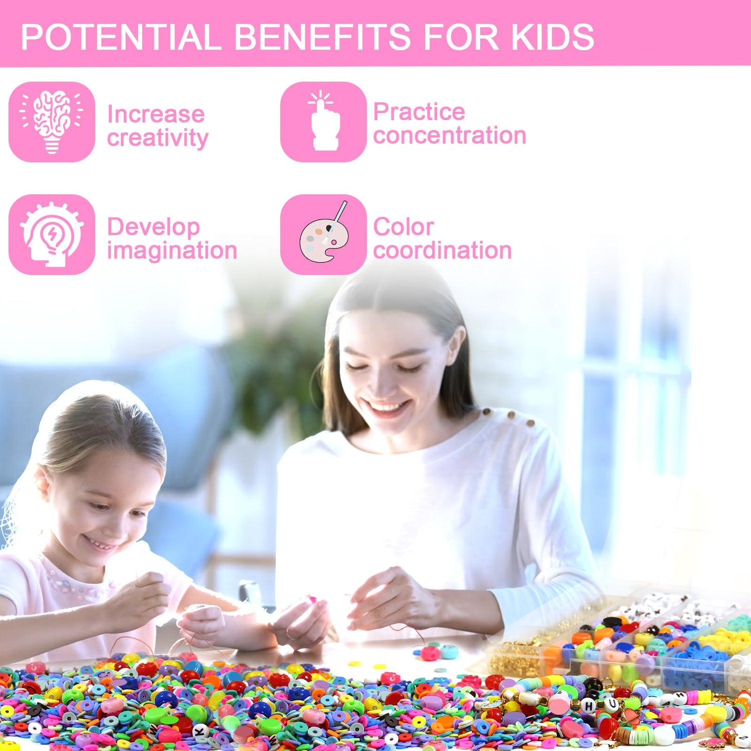 - 【Bead Kit Gifts for Girls】This clay bead kit is very helpful for the little ones to develop their imagination, creativity, and concentration. DIY crafts are full of fun, brainstorm to create your own style bracelet, jewelry, necklace or earrings. Your family or friends will certainly love to receive these handmade gifts for Christmas, birthday, valentine's day, Thanksgiving Day or Mother's Day.