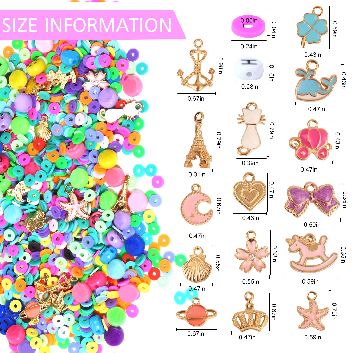 - 【Bracelet Making Kit is All In】 A box of about 5310 pcs flat clay beads in 16 colors ,15 pcs big random pendant charms. 200 Pcs Letter Beads, 100 Pcs Face Beads ,190 pcs charms kit (contains pendants, jump rings, random letter beads, lobster clasp, etc ). 1 roll of 7 meters elastic strings, a scissors. Meet all your needs for jewelry making.