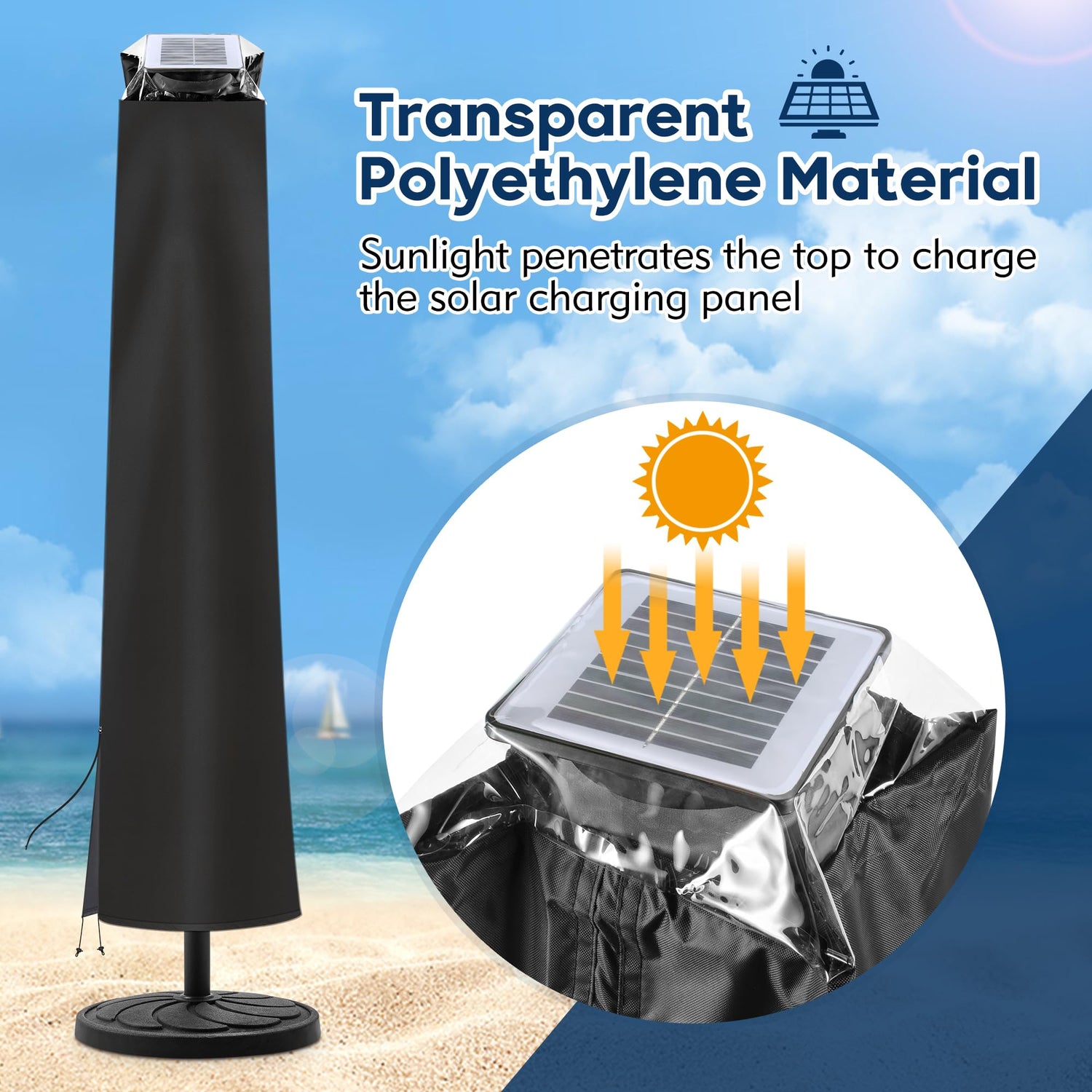 - [TRANSPARENT MATERIAL] PVC transparent material is added to the top of the umbrella cover, which can not only protect the garden umbrella but also charge the solar panel. Patio umbrella with solar lights cover 70.8in L x 16.5in W, Fits 7.5ft 9ft 10ft 11ft patio umbrella with lights (not including offset umbrellas).