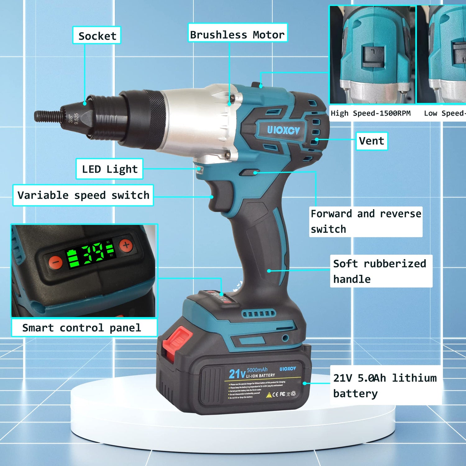 - [2 in 1 Rivet Tool]: uioxcv Dual-Use Cordless Rivet Tool device can be used for Rivet & Rivet nut two functions. Just simply change the nose for Rivet or Rivet Nut.