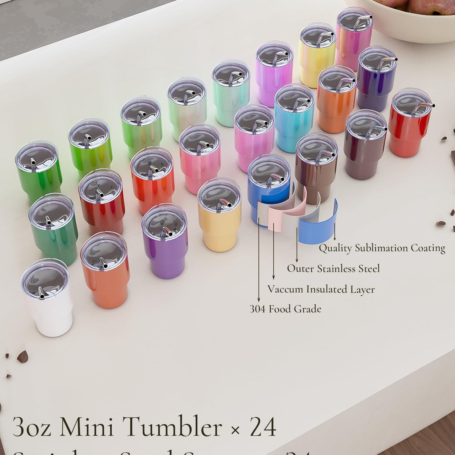 UIRZOTN 3oz Mini Tumbler Shot Glass with Straw and Lid, 24 Pack Stainless Steel Sublimation Shot Glasses for Wedding Party Whiskey Cocktail Bar with Straw and Lid