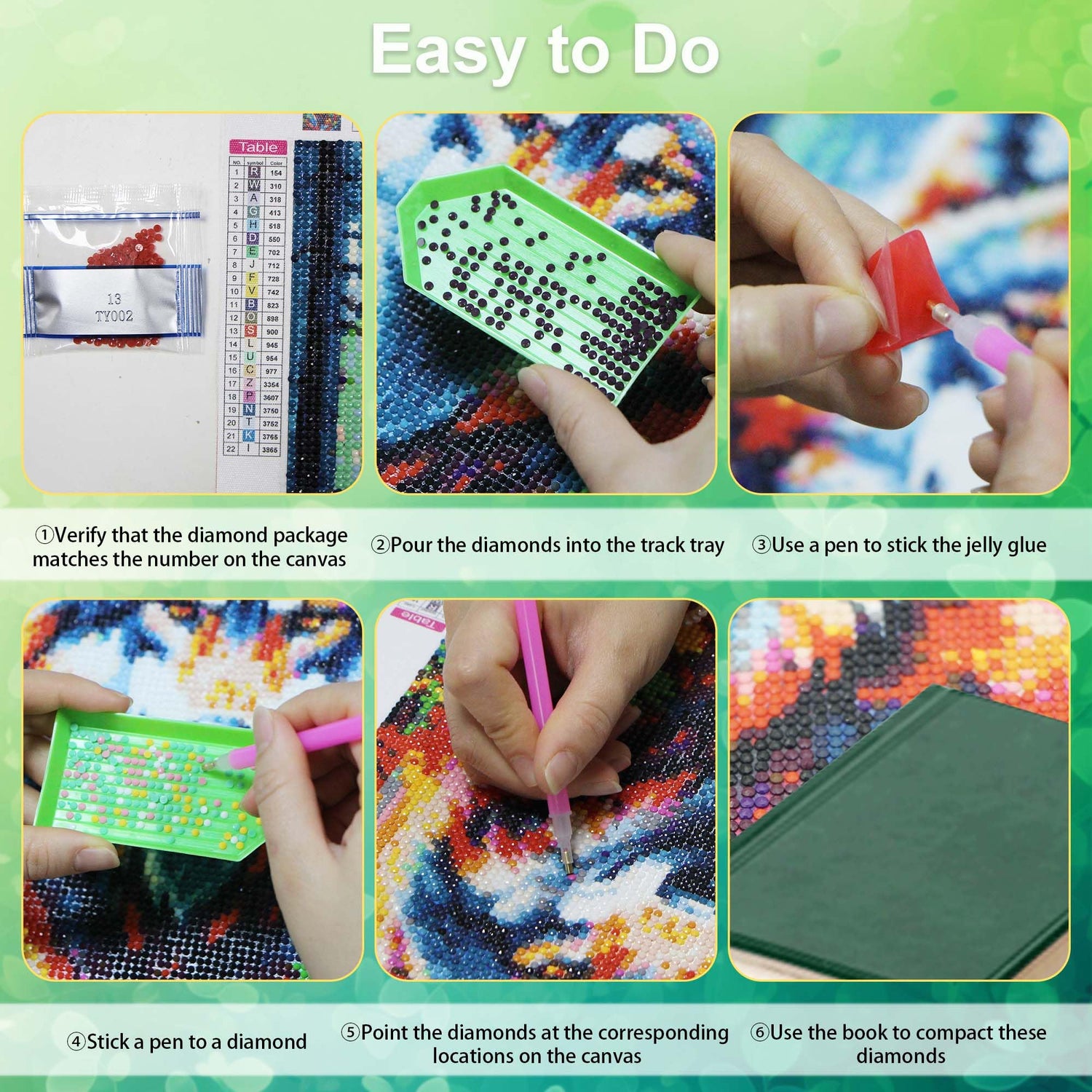 - Include:6* canvas (12x16 inches), 6* diamond pens, 6* glue, 6* plastic trays, several self-sealing bags and enough round diamonds. Each color comes with about 20% more beads. Fulfills all your needs