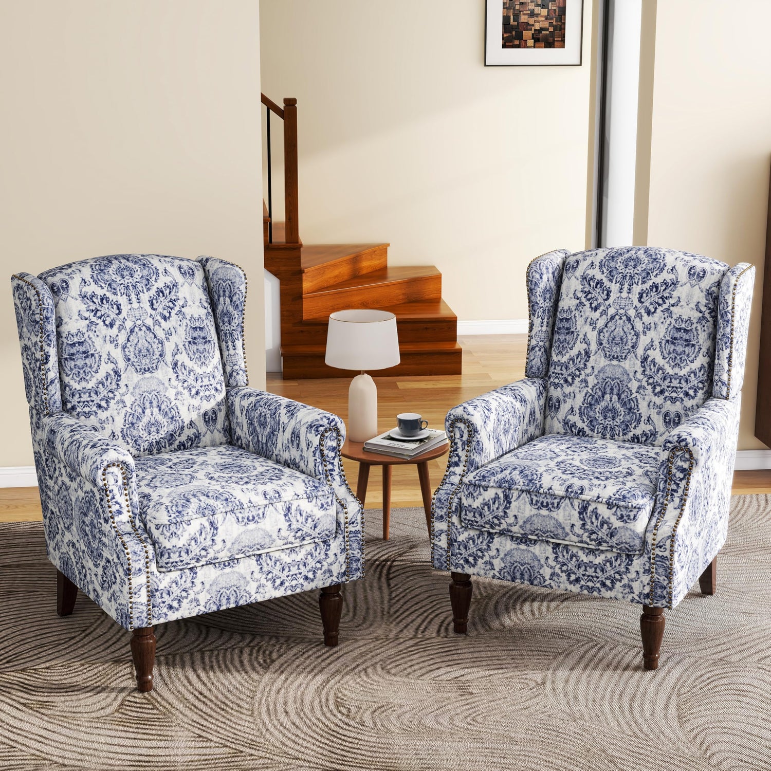 UIXE High Back Floral Accent Chairs Set of 2, Upholstered Armchair in Fabric, Retro Printed Wingback Arm Chair for Living Room, Nailhead Trim Single Sofa Bedroom Reading Seat - Navy Blue