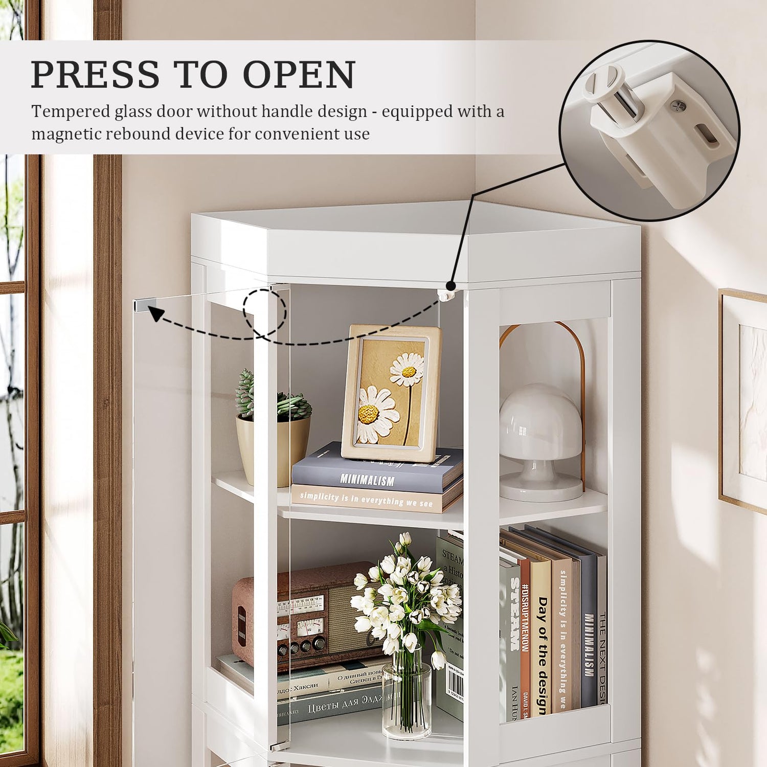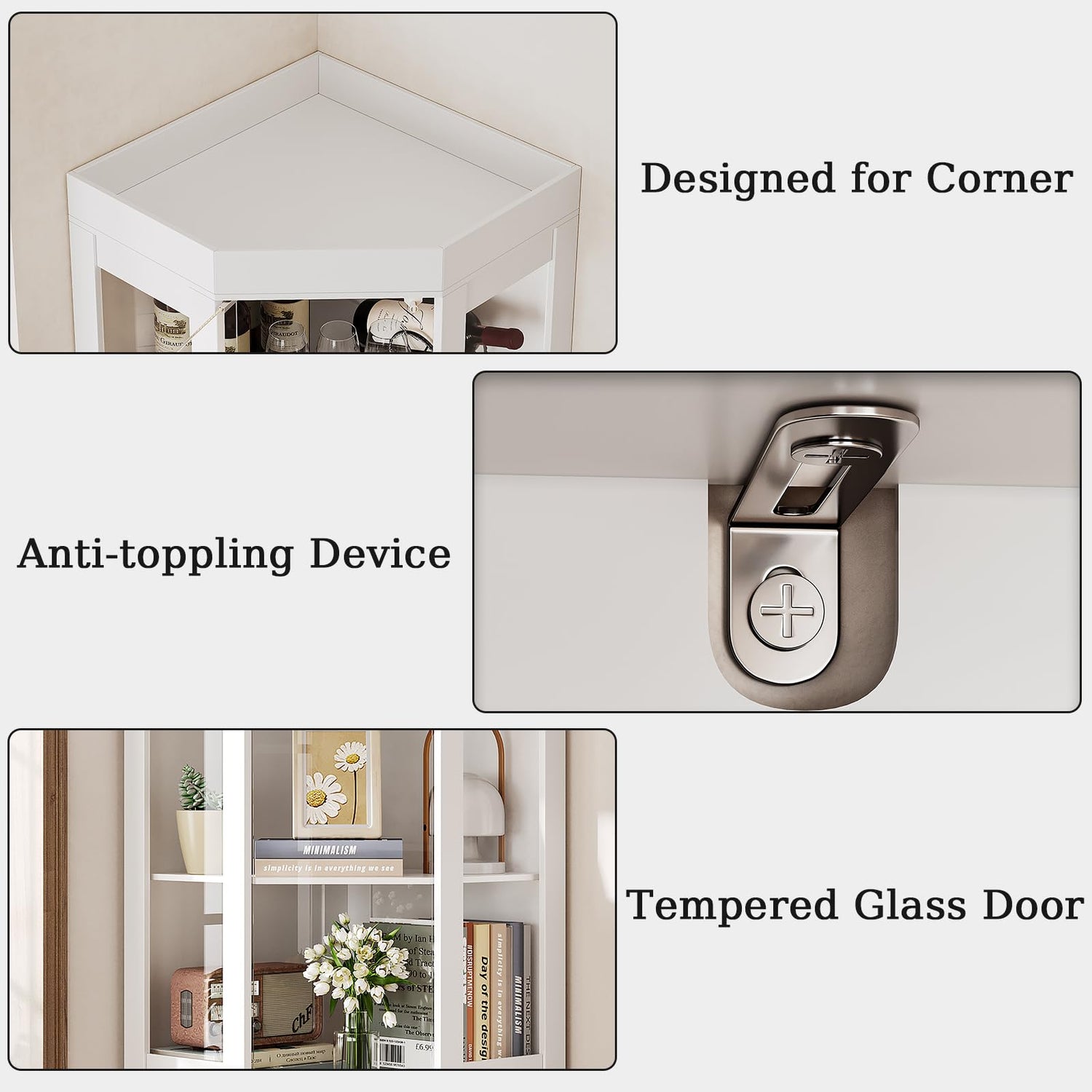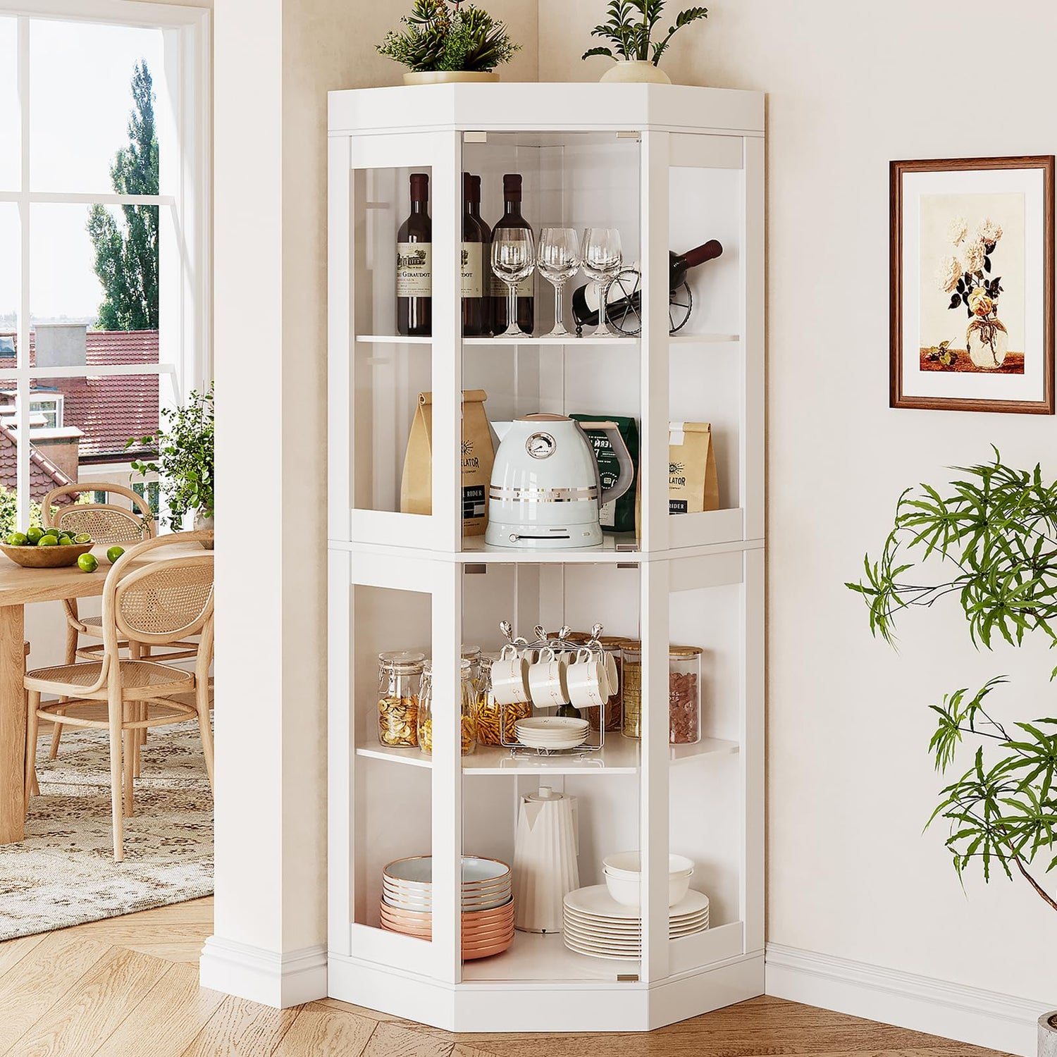 UKAOCAI 70''H Tall Corner Cabinet with Glass Doors,Farmhouse Storage Cabinet with 4 Shelves & Top Guard Rail,Home Pantry Hutch for Bar,Kitchen, Dining Living Room, Bathroom, White