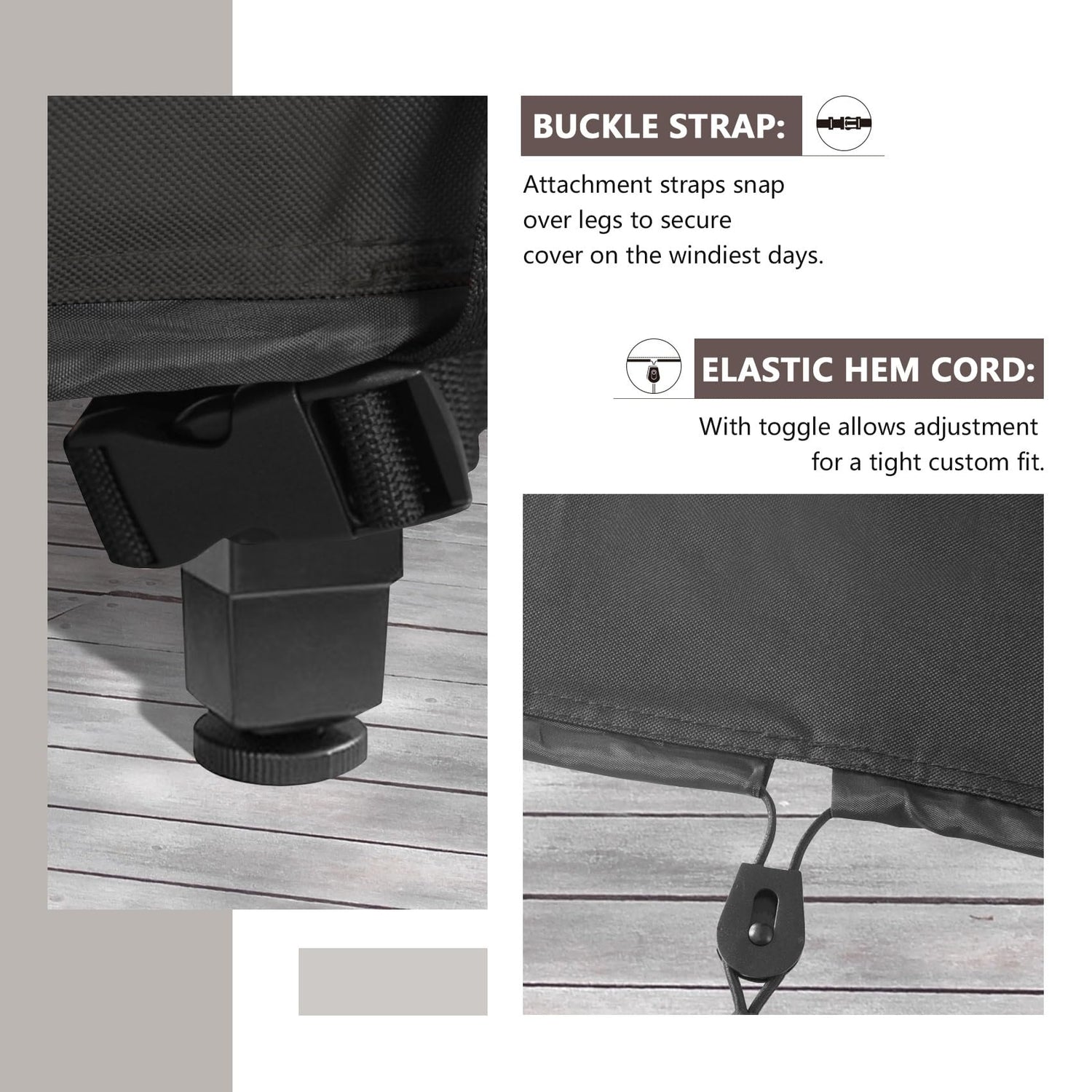 Details: Dimension -Size Square M: 56"(L)x56"(W)x28"(H), fits for table with chairs up to 54x54 inch -Size Square L: 76"(L)x76"(W)x28"(H), fits for table with chairs up to 74x74 inch -Size Square XL: 96"(L)x96"(W)x28"(H), fits for table with chairs up to 94x94 inch -Size Rectangular M: 90"(L)x64"(W)x28"(H), fits for table with chairs up to 88x62 inch -Size Rectangular L: 113"(L)x76"(W)x28"(H), fits for table with chairs up to 111x74 inch -Size Rectangular XL: 138"(L)x76"(W)x28"(H), fits for table with chairs up to 136x74 inch Material: Polyester About Product: 1. ULTCOVER patio table cover made of heavy duty water-resistant polyester fabric. 2. Outdoor furniture cover will protects your furniture from dirt, dust, rain, bird droppings, UV rays etc. 3. Side air vent reduce inside condensation and wind lofting. 4. Reinforced handles for easy fitting and removal. 5. Attachment straps snap over legs to secure cover on the windiest days. 6. Elastic hem cord with toggles allows adjustment for a tight custom fit. 7. 3 years warranty. We provides the best quality, long lasting furniture cover, our covers weights much heavier than other covers on the market. Make sure to measure your furniture before you choose cover size. For more high quality patio covers please visit ULTCOVER Amazon Store.