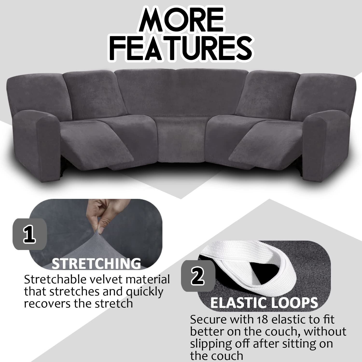 ULTICOR 7-Piece Sectional Sofa Covers, Velvet Stretch Reclining Couch Covers for Reclining L Shape Sofa, Thick, Soft, Washable (Dark Grey, 5 Seat Recliner Cover)
