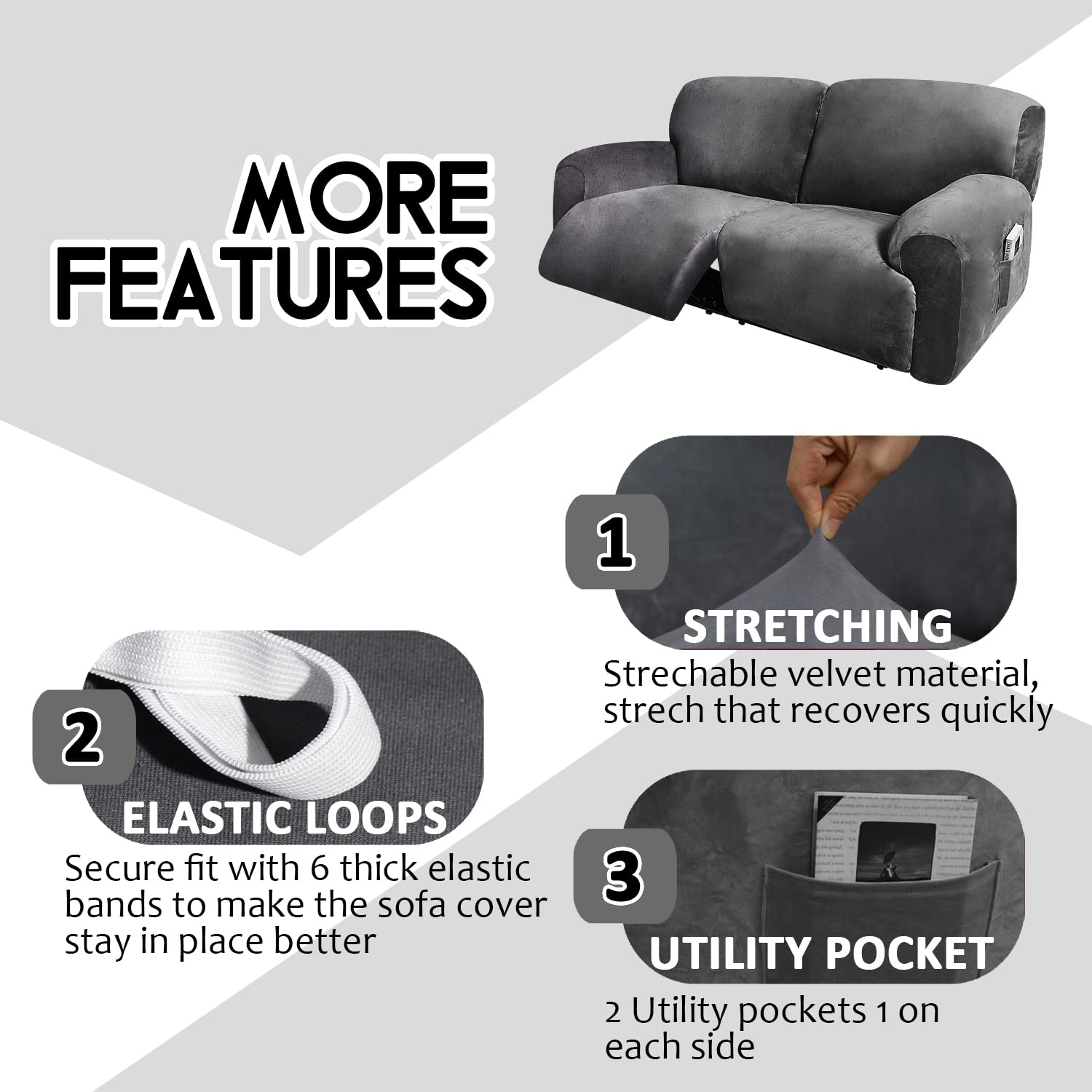 ULTICOR Extra Wide 75-100" 2 Seater Reclining Sofa Slipcover, Velvet Stretch 6-Piece, Soft Washable (Dark Grey)