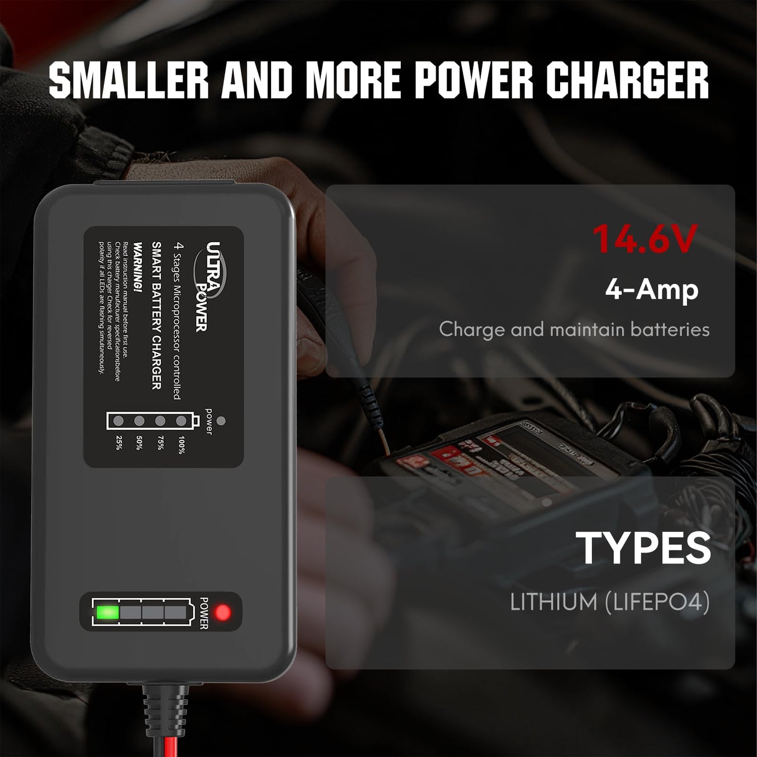 - [LiFePO4 Battery Charger]:The ULTRAPOWER 4-Amp LiFePO4 Lithium battery charger is designed for 12.8 Volt-14.6 Volt batteries.perfect for charging Car,Motorcycle,Racing,ATV,UTV,Trucks,Fishing Boat,RV,Lawn Tractors,Electric Sports,Law Mowers,Snowmobiles,Golf Carts,Golf trolley battereis ect.