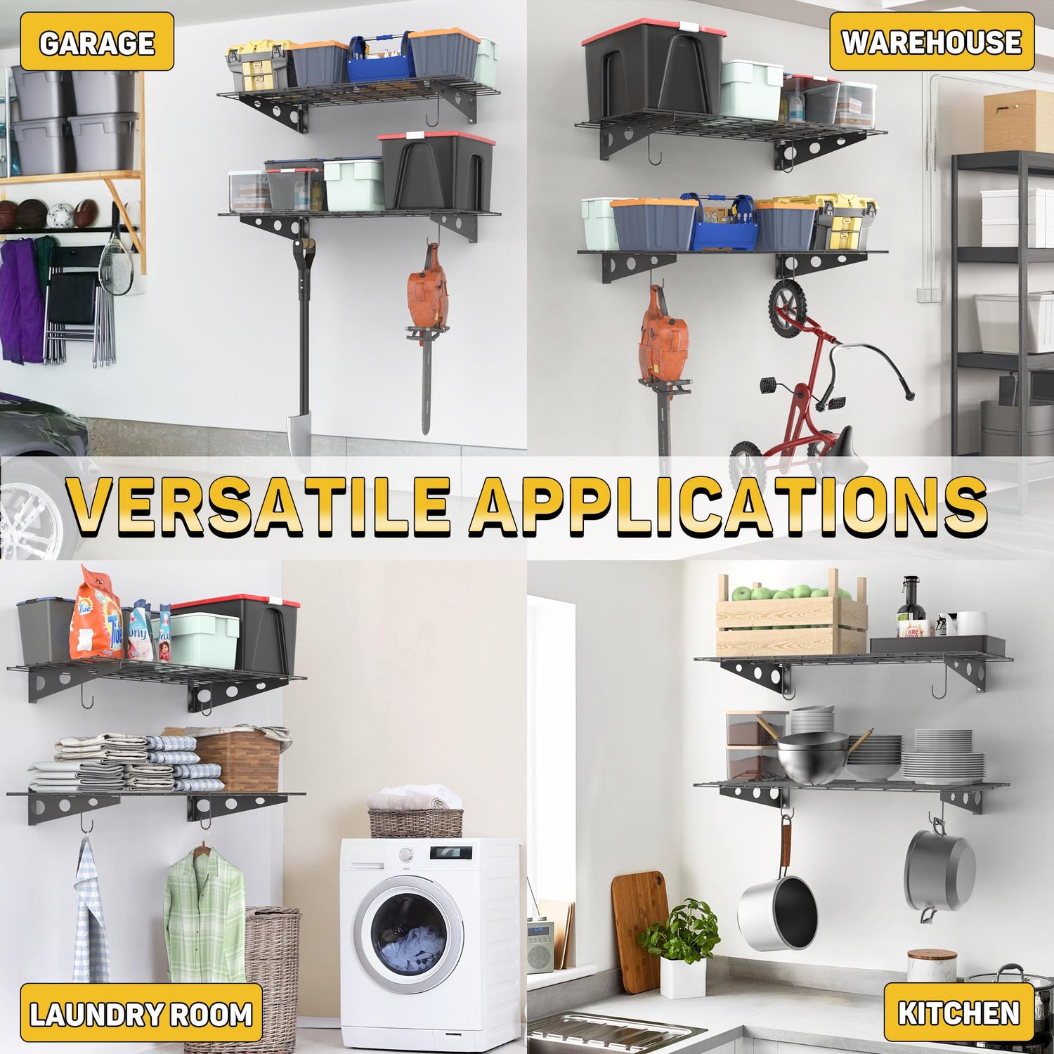 - Maximize Your Space: The wall-mounted storage shelves help you bring harmony to your space. Clear your garage floor, reduce clutter, and create an orderly space where tools, sporting goods, and more can rest peacefully