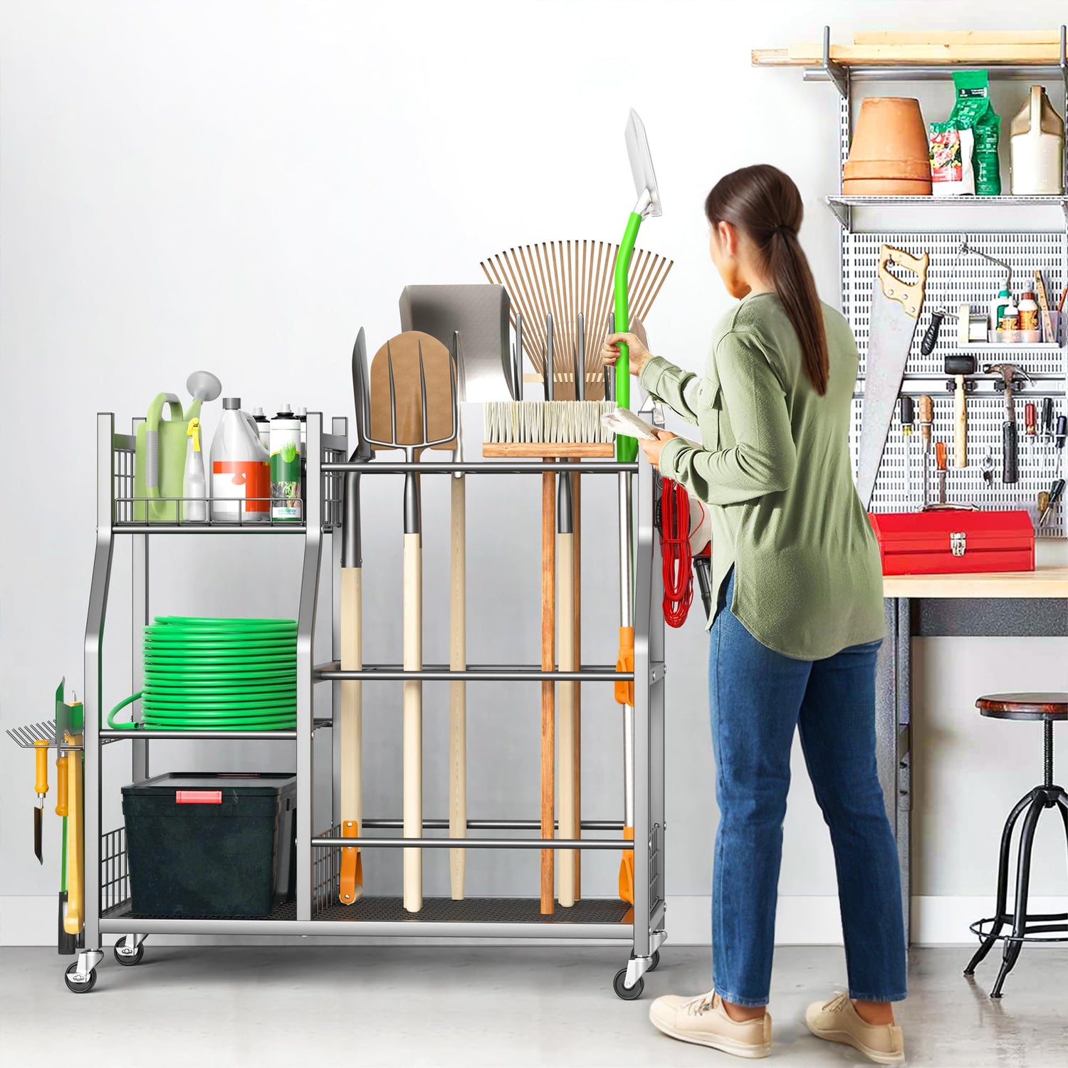 Ultrawall Garden Tool Organizer, Yard Tool Storage Rack for Garage Organization with Lockable Wheels, Garden Tool Stand for Rake, Brooms, Indoor & Outdoor Use