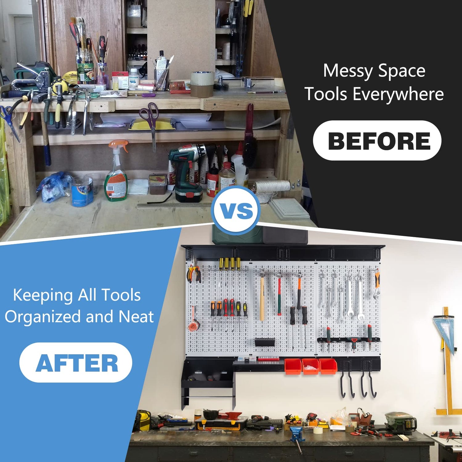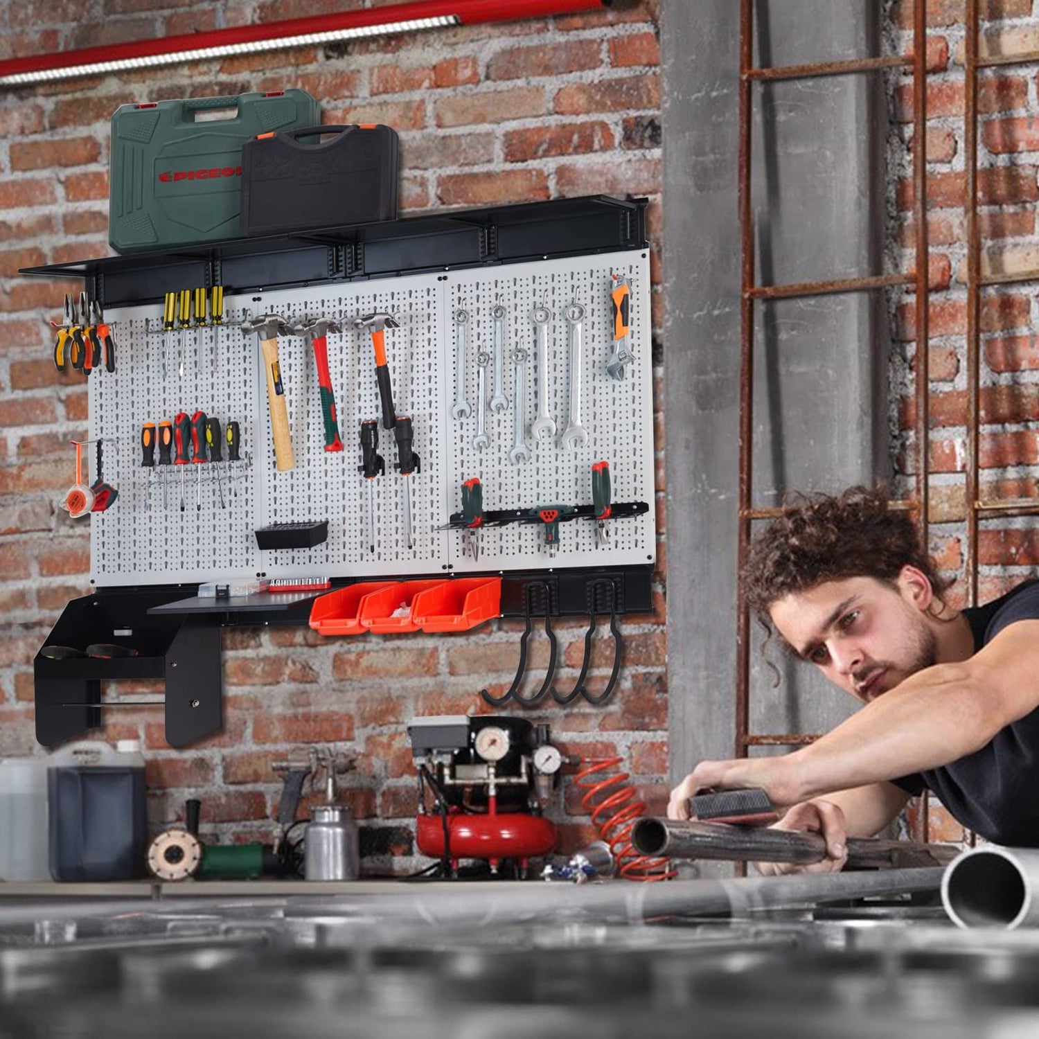 - All-In-One Storage Solution - Comes with 3 pegboards, 4 steel rails, 2 overhead shelves, 1 small shelf, 1 paper towel shelf, 2 multi-purpose hooks, 3 storage bins, 43 mini hooks, 16 plastic hooks, and 30 fixing clips. The variety of hooks and shelves allow you to neatly organize all your garage and household items.