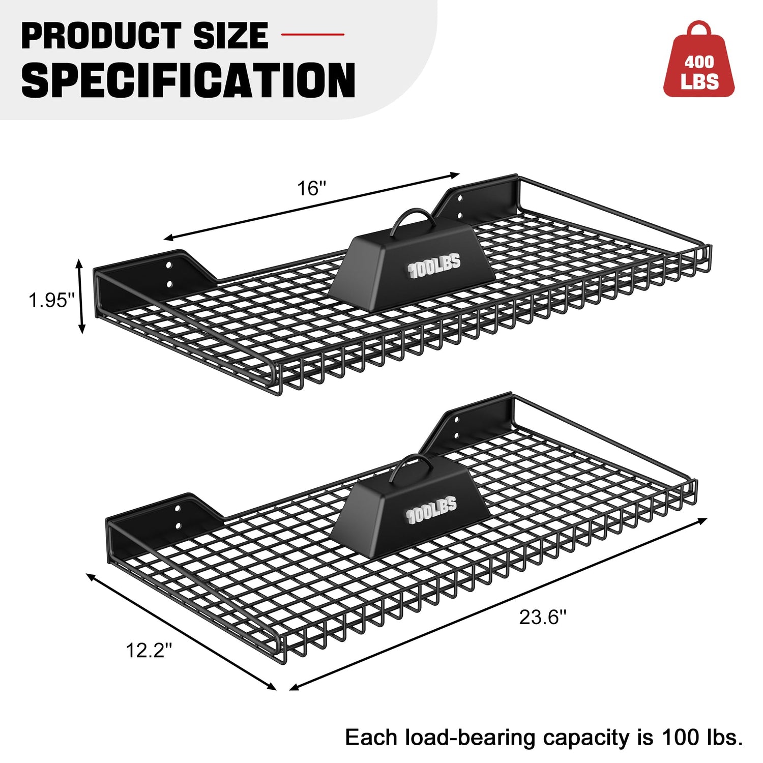 - Space Optimization: Maximize your garage space with these sturdy wall shelves, offering an efficient storage solution. Organize tools, equipment, and more, freeing up valuable floor space for your vehicles or other activities