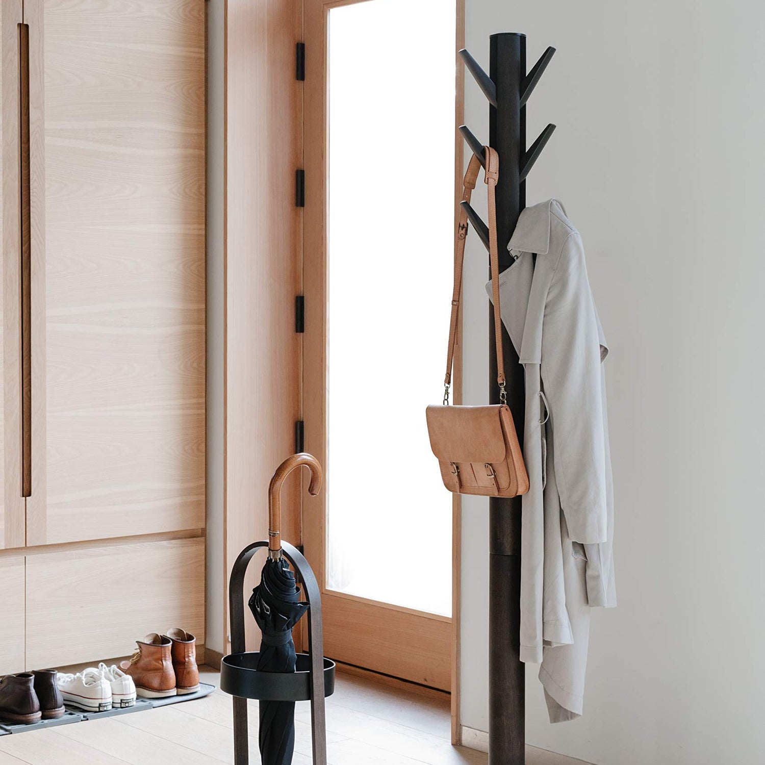 Details: It’s nice to have a free-standing coat hanger in your front entryway because it keeps coats, jackets, and other clothing items quickly accessible; especially in small places with limited closet space. Introducing the Flapper by UmbraFlapper by Umbra is a hall tree type of free-standing wooden coat rack, clothing rack or hat rack that stands tall and sleek. It has nine flip-down hooks, that provide ample storage for jackets, hats, umbrellas and more, which can be tucked away when not in use. For a coat rack that has ample utility, works great in compact spaces, and is ideal for anyone in need of extra storage, order Flapper from Umbra today. About Umbra: A global product design company providing original, modern, casual and functional design for the home.