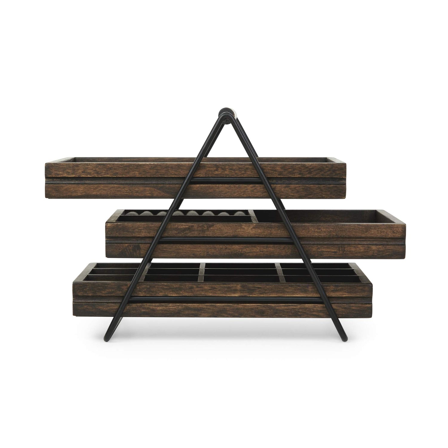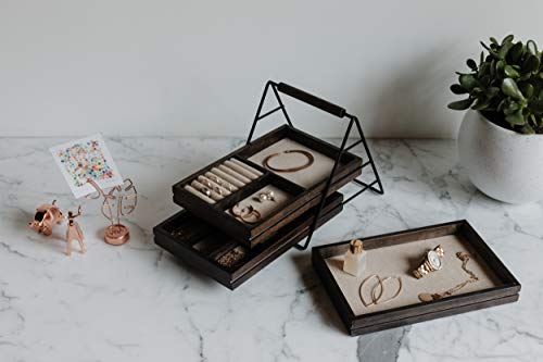 - ELEGANT AND MODERN JEWELRY TRAY: Terrace has three sliding linen-lined wood jewelry trays made of Paulownia wood in a walnut finish, a black metal frame, and wooden handle