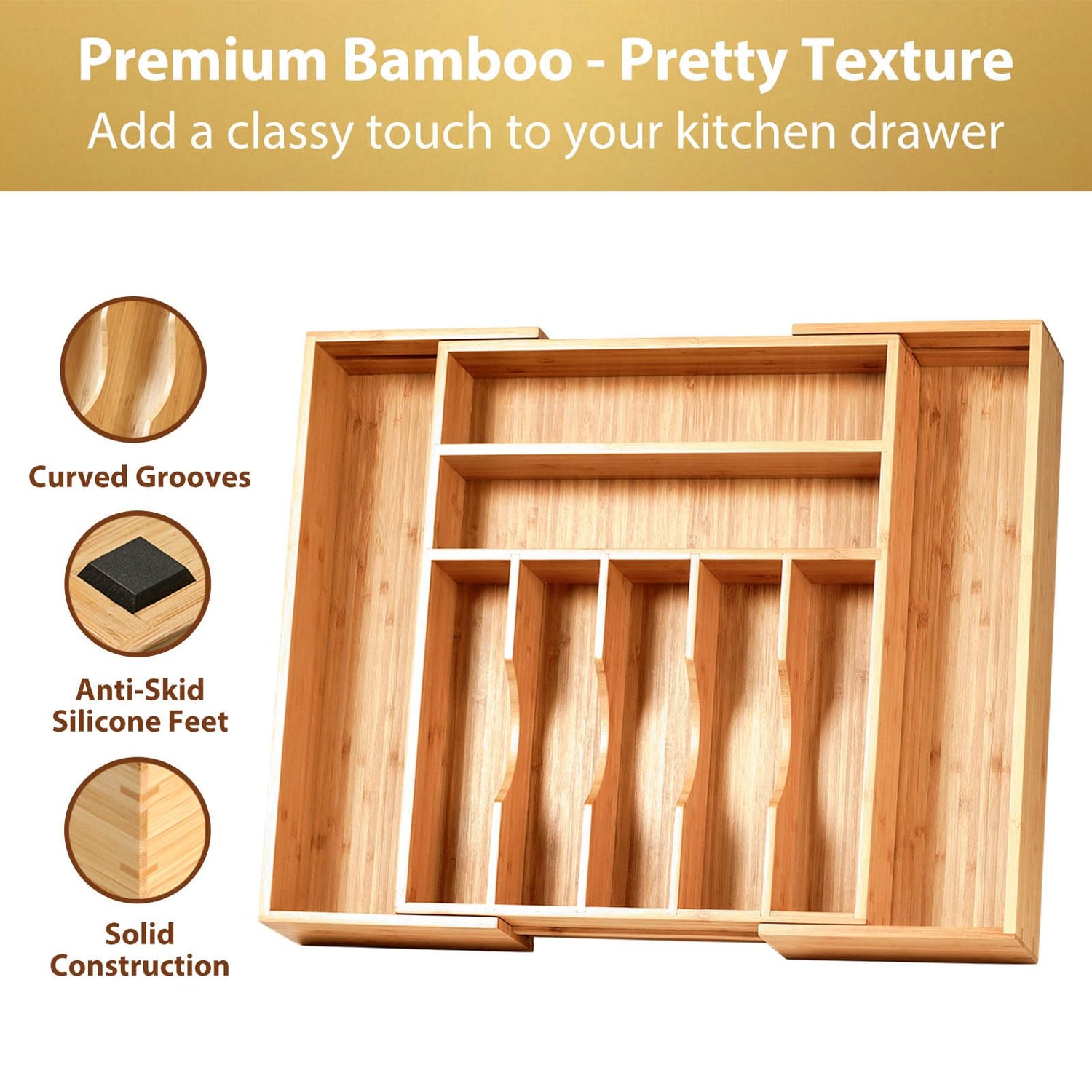 - ANTI-SKID: 8 big silicone feet keep this silverware organizer immobile and quiet when pulling out and pushing back the drawer.
