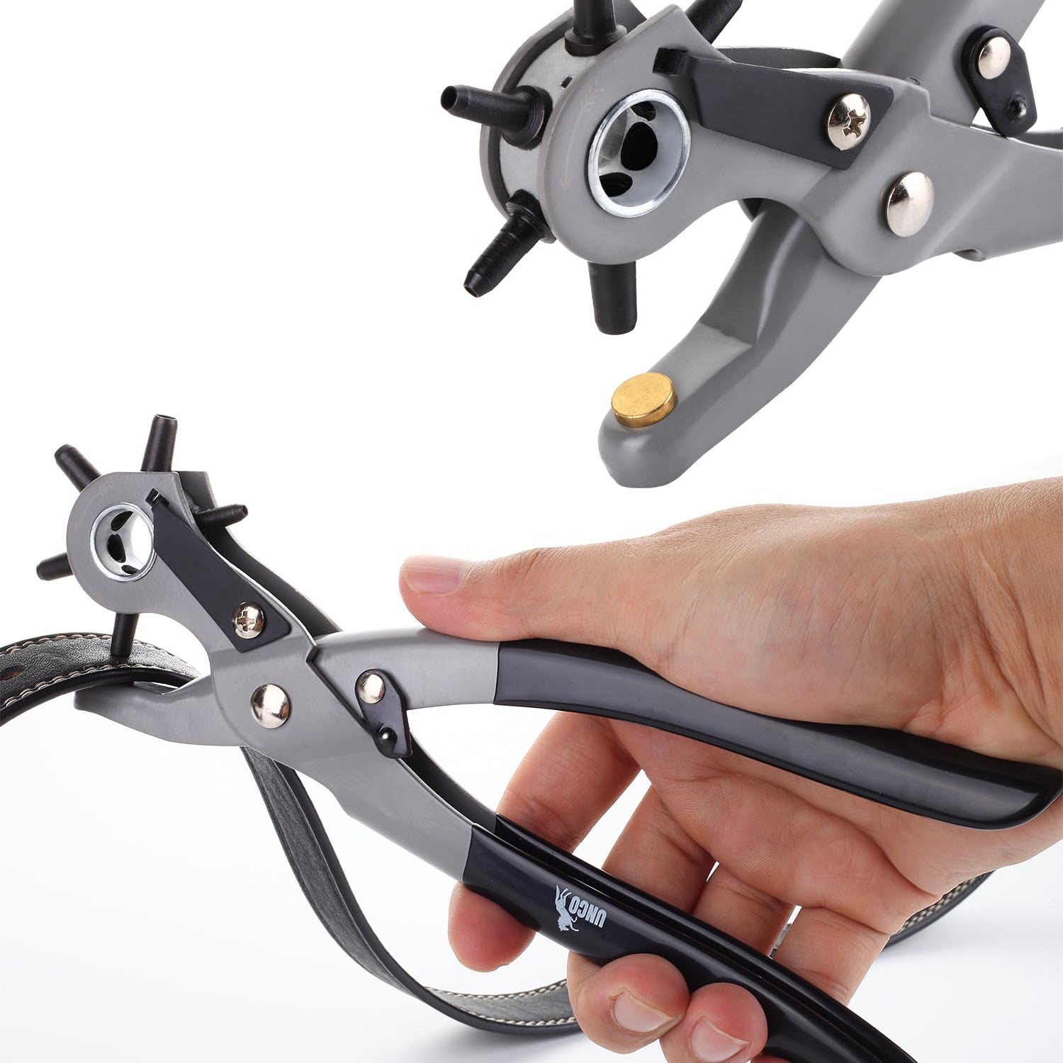 - UNCO punch plier is commonly used for punching round holes in leather, belts, plastic, rubber, canvas, fabric, cardboard, saddles, and similar materials.