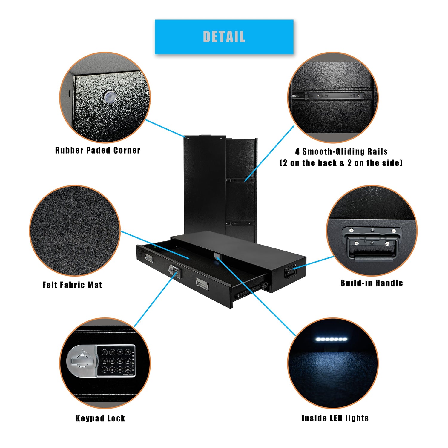 - Heavy-Duty Construction: Made from 16-gauge steel, this truck gun caddy is tamper-resistant and pry-proof. From its exterior to its interior locking bolts, this hidden gun drawer is crafted with heavy-duty steel to keep your firearm secure.