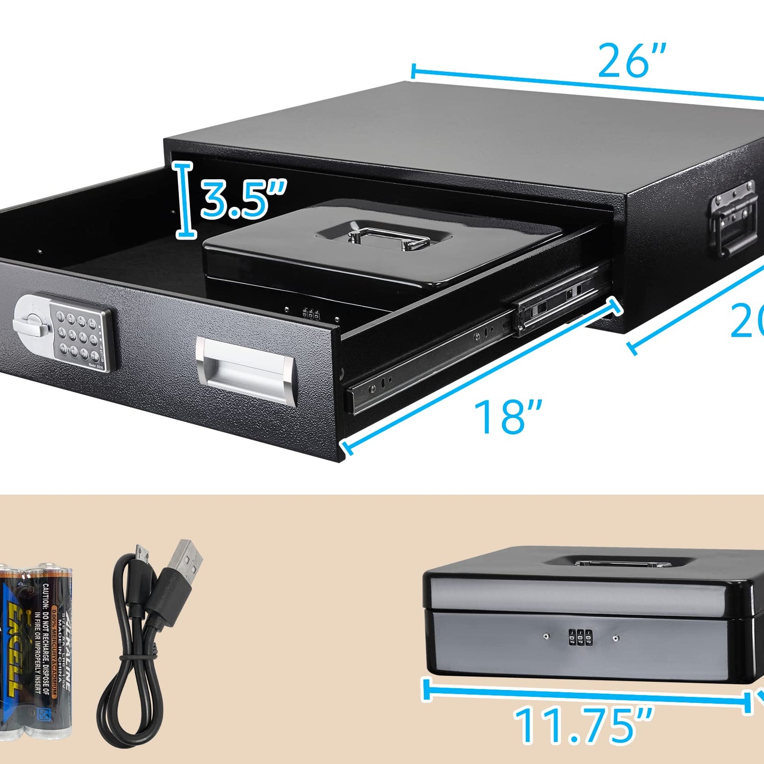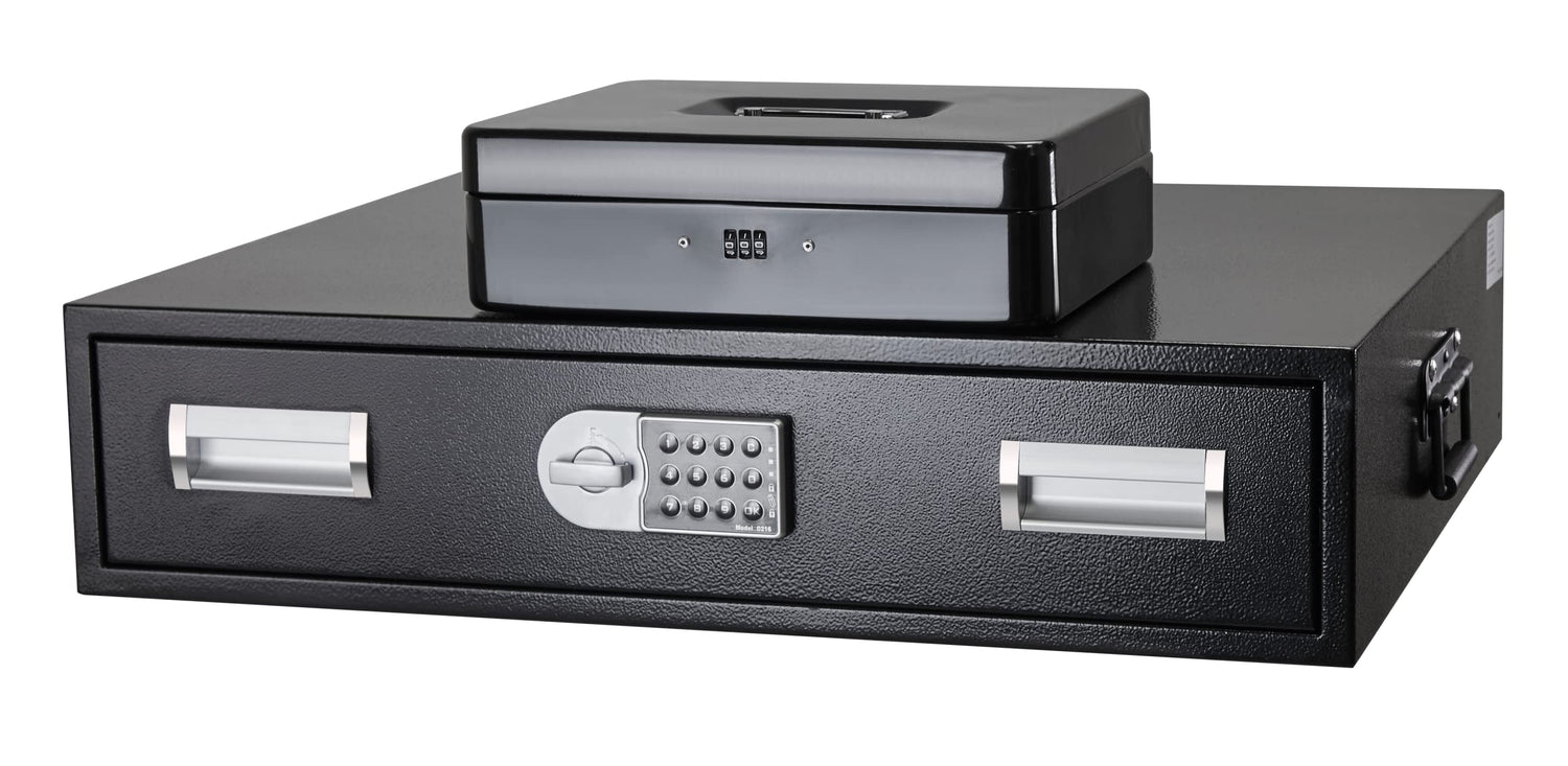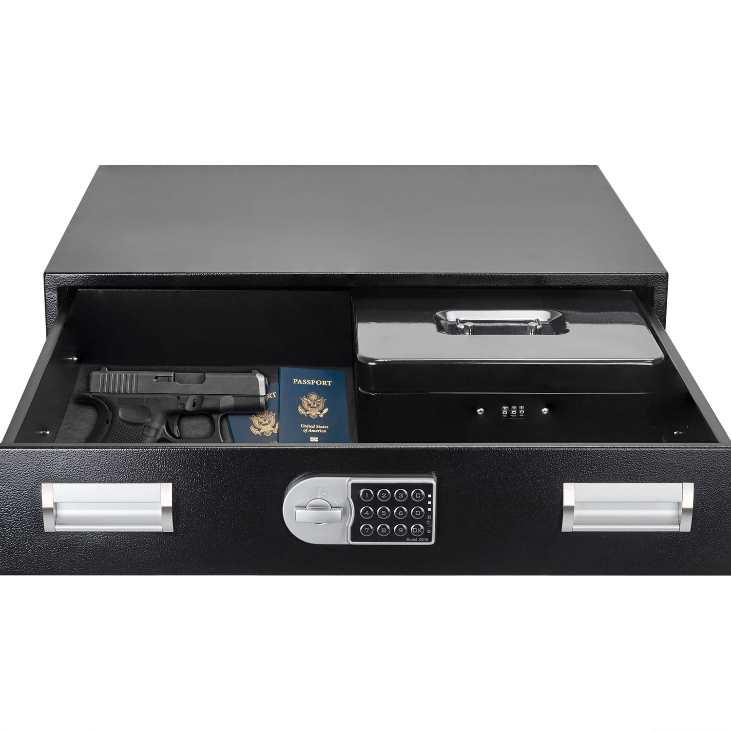 - ๐ HEAVY DUTY GUN SAFE: This pistol caddy for truck is made of 16 gauge steel, which makes this bedroom gun safe tamper-resistant and pry-proof. From the exterior gun storage safe to the interior locking bolts, this hidden gun drawer is constructed of heavy duty steel that will keep your firearm secured.