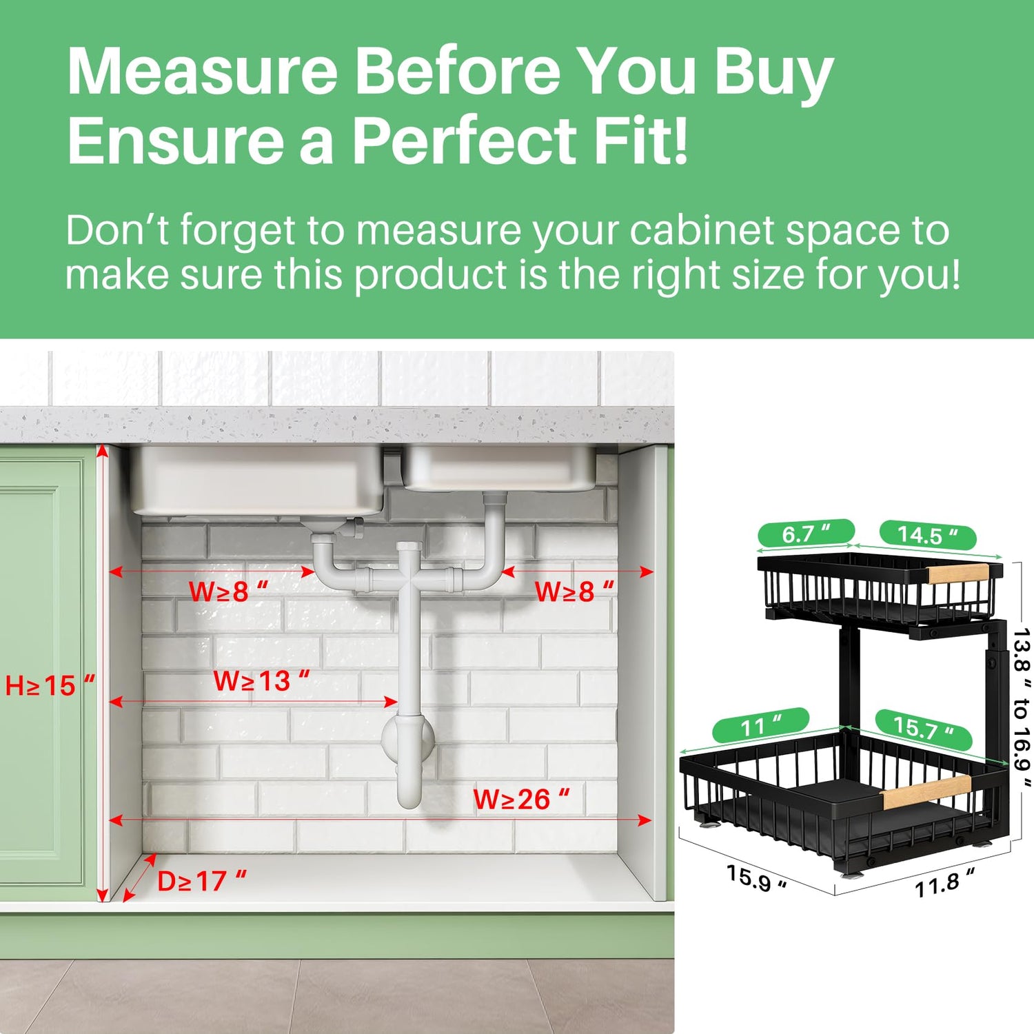 - Larger Organizer for Maximum Efficiency: This under sink organizer, measuring 11.8"W x 15.9"D x (13.8"-16.9")H, providing more capacity for storing taller bottles, cleaning supplies and other essentials.Before purchasing, please double-check your cabinet dimensions to ensure this under cabinet organizer fits properly.