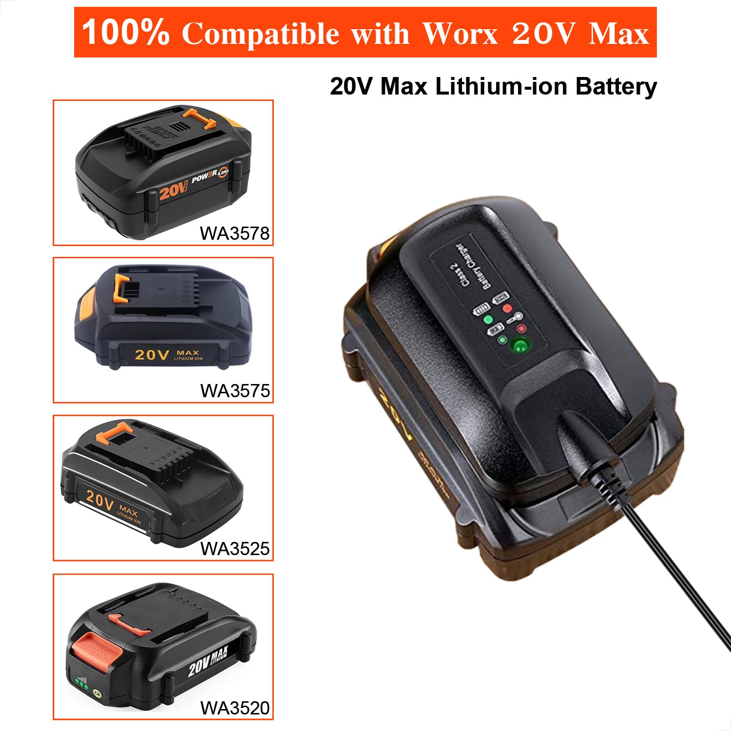 - Replacement for WORX charger WA3742 be used to charge WORX 20 volt lithium batteries: WA3520 WA3525 WA3512 WA3512.1 WA3522 WA3544 WA3575 WA3578.