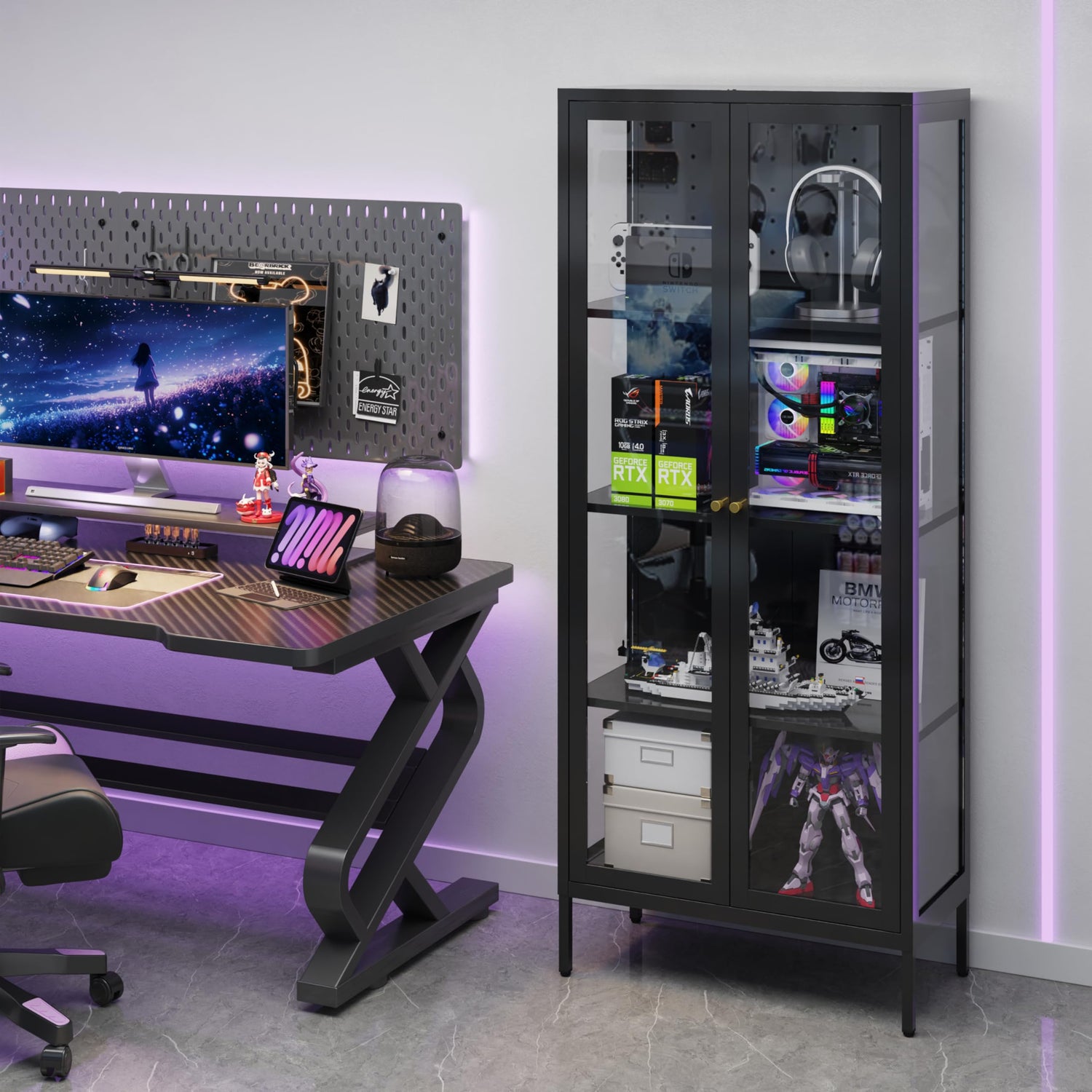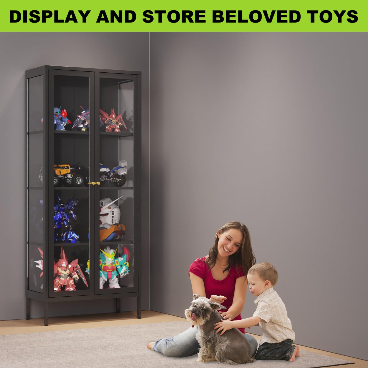 UNICOLY Glass Display Cabinet 4-Tier, Display Cabinet with Glass Doors, Curio Display Cabinet with Tempered Glass Doors,Metal Storage Cabinets for Living Room, Plant, Assembly Required, Black