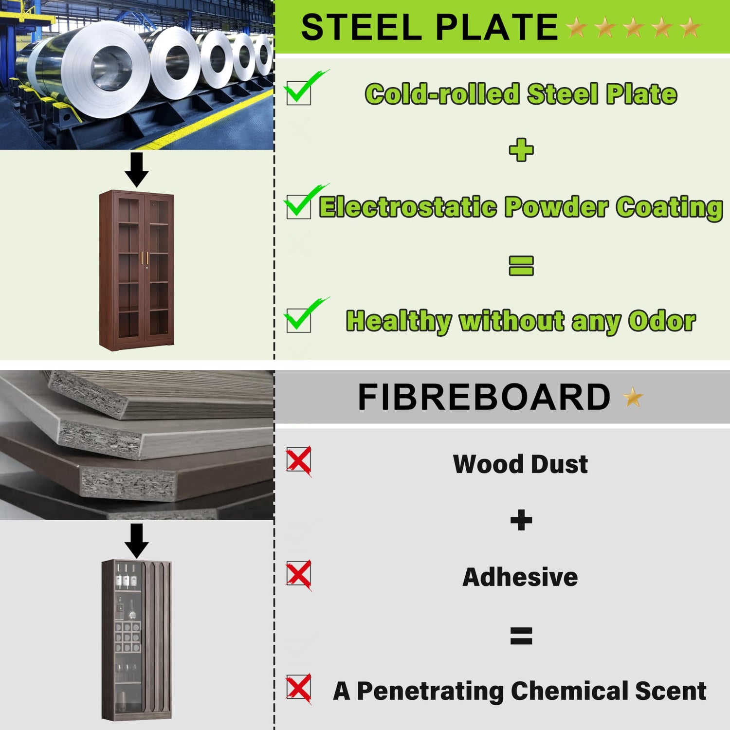 - MATERIAL: The kitchen food storage cabinet is crafted from cold-rolled steel plate(SPCC), ensuring it is sturdy and sturdy. Steel plates are covered with an environmentally friendly powder coating. When compared to traditional wooden or plastic cabinets, our glass display cabinet is corrosion-resistant, easy to clean, and odourless.