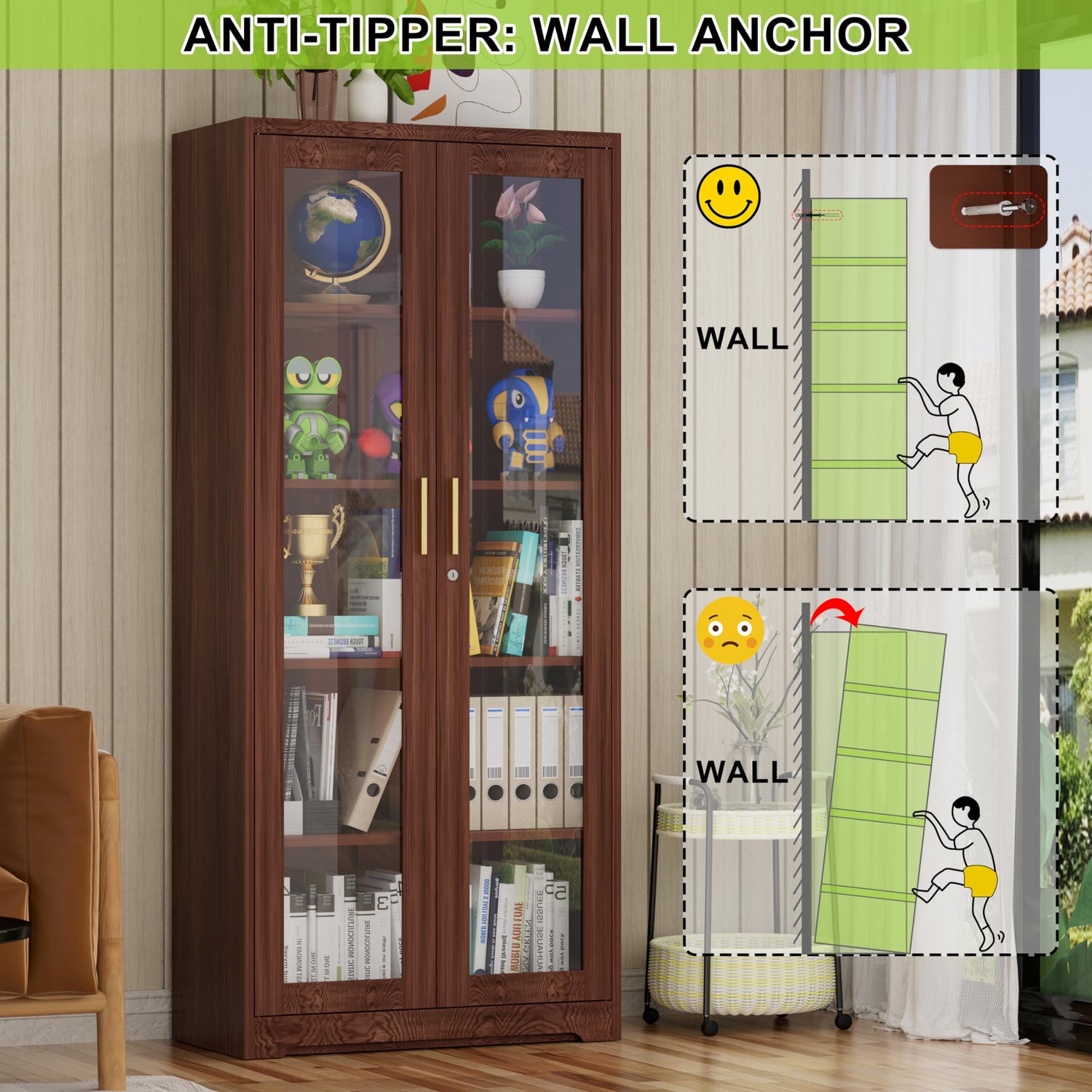 - SECURITY PRACTICAL DESIGN: The back panel of the metal locker storage cabinet features two holes, the cabinets can be mounted to the wall, prevent tipping. Two doors of the pantry cabinet is crafted from tempered glass. Even if accidentally damaged, there will be no sharp glass fragments scattered.
