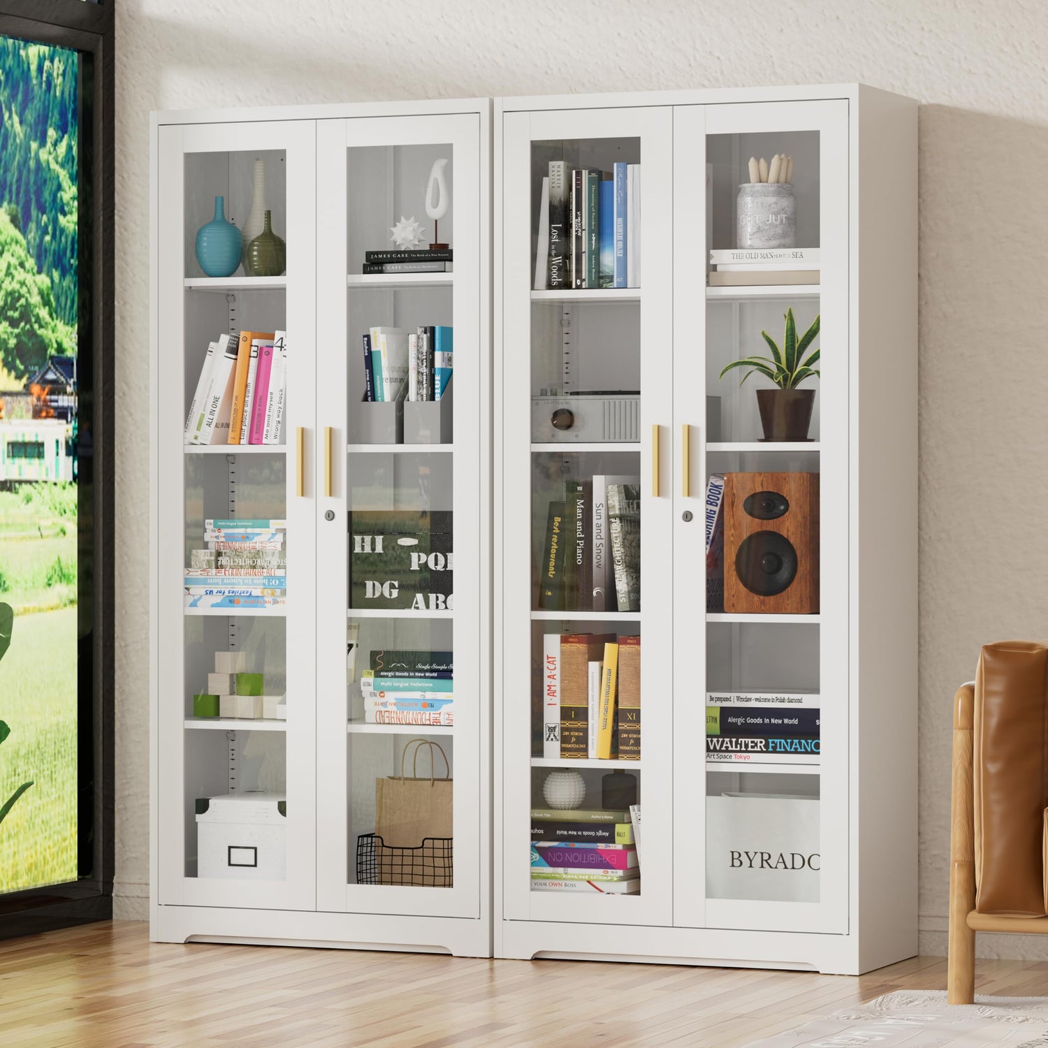 UNICOLY Storage Cabinet with Doors and Shelves, Display Cabinet with Glass Doors, Pantry Cabinet, Curio Cabinet with Locking Doors, Metal Storage Cabinet for Office,Kitchen,Living Room 71” H White