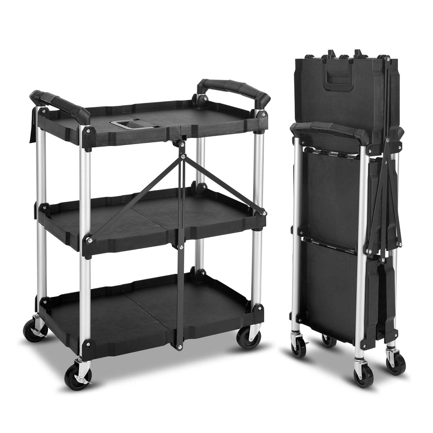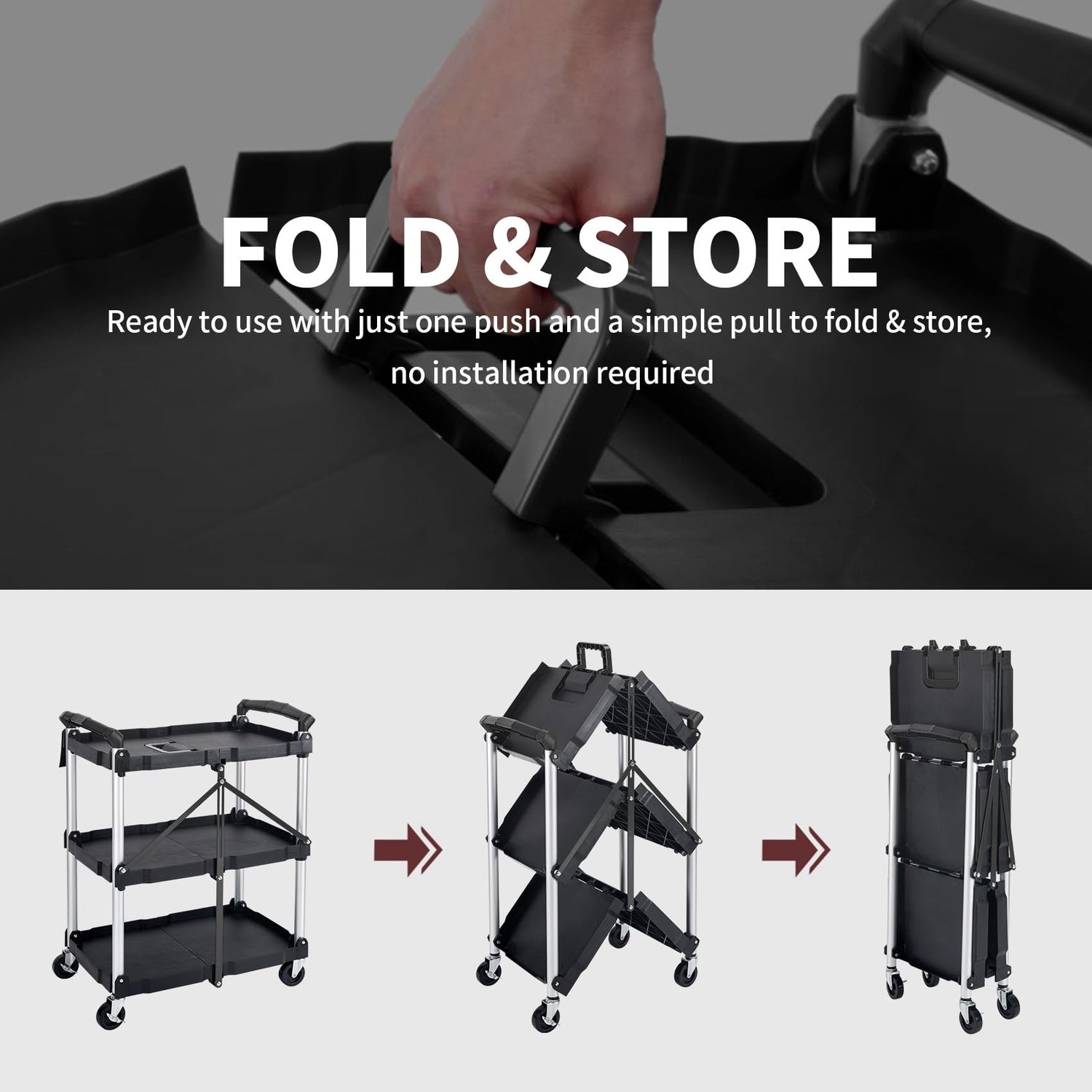 UNICOO® Heavy Duty 3-Tier Collapsible Rolling Cart, Folding Utility Cart, 550lbs Capacity, Lockable & Silent Wheels, Compact & Foldable, Easy Clean & Storage for Restaurant, Office, Garage (Black)